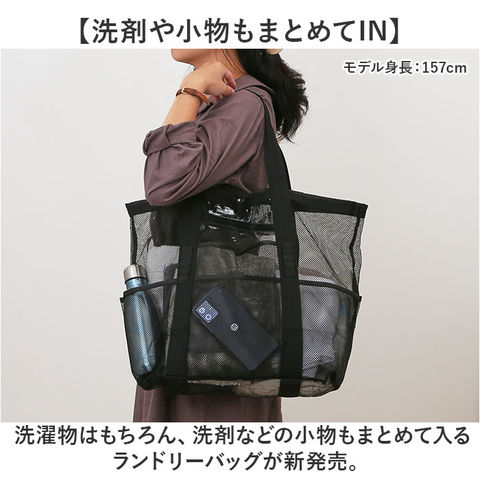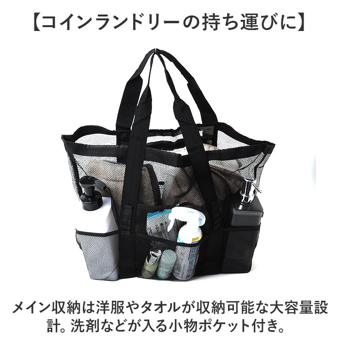 | 商品説明 | 【洗剤や小物もまとめてIN】洗濯物はもちろん、洗剤などの小物もまとめて入るランドリーバッグが新発売。【コインランドリーの持ち運びに】メイン収納は洋服やタオルが収納可能な大容量設計。洗剤などが入る小物ポケット付き。【濡れた衣類やタオルを入れても】通気性が抜群なメッシュ素材なので洗濯後や使用後のタオルや衣類を入れてもOK!【ビニールポケット付き】内装ポケットはビニール仕様で、水が侵入しにくい♪濡らしたくない小物入れに。【様々なシーンで使える】お子さまの外遊び用の小物入れや、スパバッグとして使うのもオススメ♪【折りたためて持ち運び楽ちん】使わない時はコンパクトに折りたたみもでき、持ち運びやすいのも魅力的。【ポケット仕様】メインルーム・・・ファスナーポケット×1アウトポケット・・・オープンポケット×7 |