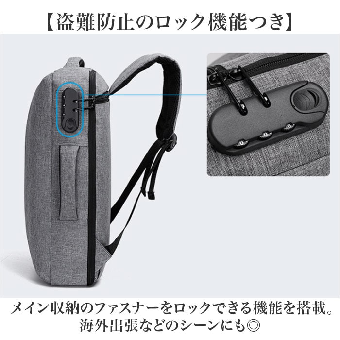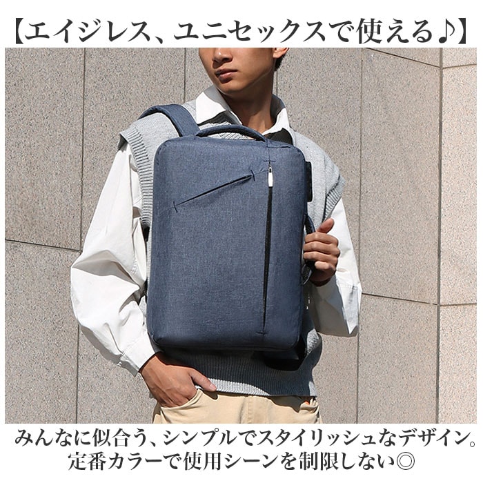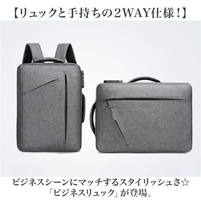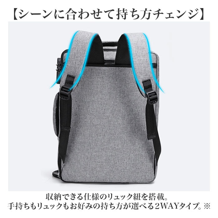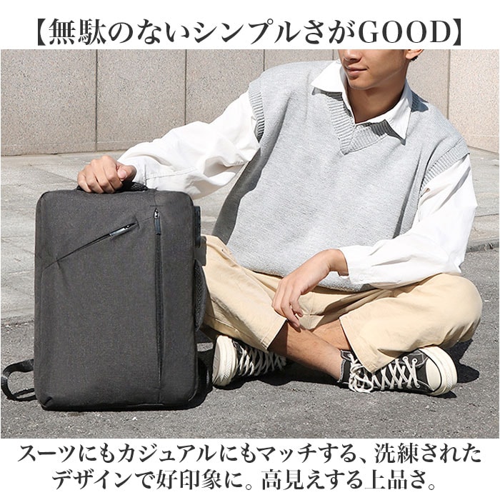 | 商品説明 | 【リュックと手持ちの2WAY仕様!】ビジネスシーンにマッチするスタイリッシュさ☆「ビジネスリュック」が登場。【シーンに合わせて持ち方チェンジ】収納できる仕様のリュック紐を搭載。手持ちもリュックもお好みの持ち方が選べる2WAYタイプ。※サイドと背面にリュック紐を収納できる作り。【無駄のないシンプルさがGOOD】スーツにもカジュアルにもマッチする、洗練されたデザインで好印象に。高見えする上品さ。【PCも書類も入るサイズ感◎】デバイスの持ち運びも安心のクッションINポケットを搭載。A4が入るちょうどよいサイズ。【盗難防止のロック機能つき】メイン収納のファスナーをロックできる機能を搭載。海外出張などのシーンにも◎【クッションつきで快適に持ち運び】持ち手とリュック紐にはクッションをIN!重い荷物の持ち運びの負担を軽減。【エイジレス、ユニセックスで使える♪】みんなに似合う、シンプルでスタイリッシュなデザイン。定番カラーで使用シーンを制限しない◎【ポケット仕様】フロント:ファスナーポケット×2メイン:オープンポケット×1、ファスナーポケット×1、PCポケット×1 |
