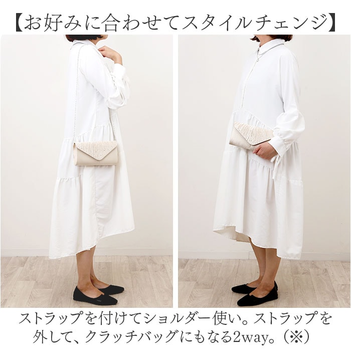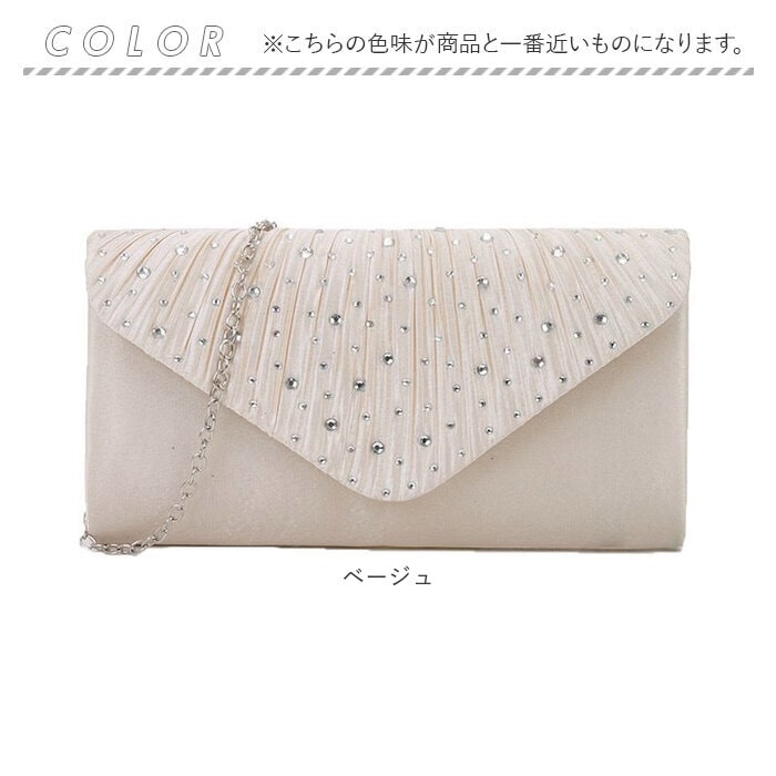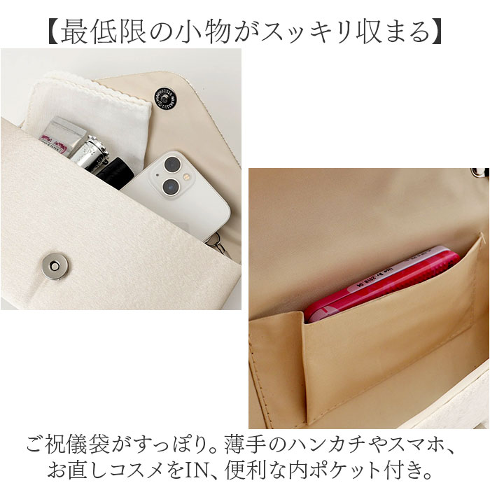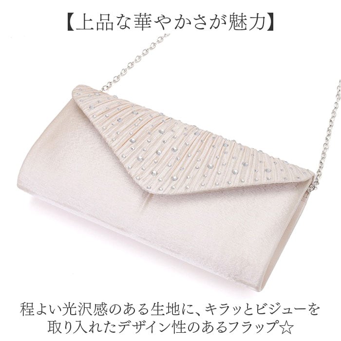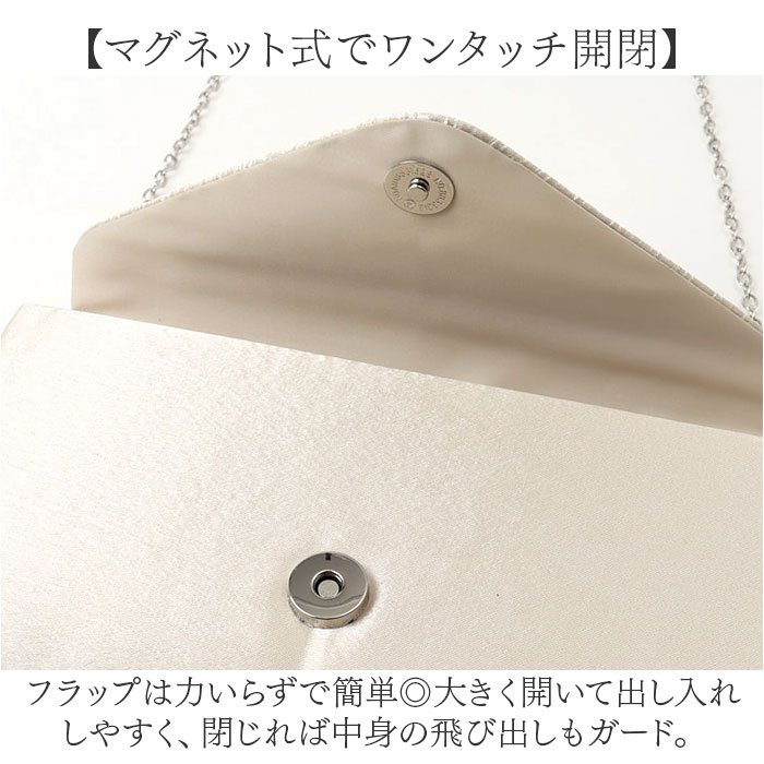 | 商品説明 | 【フォーマルなシーンでコンパクトに】パーティーや結婚式のお呼ばれシーンで大活躍♪おしゃれな「パーティーバッグ」。【上品な華やかさが魅力】程よい光沢感のある生地に、キラッとビジューを取り入れたデザイン性のあるフラップ☆【お好みに合わせてスタイルチェンジ】ストラップを付けてショルダー使い。ストラップを外して、クラッチバッグにもなる2way。(※)バッグ内側にストラップを取り付けるフックがあります。【マグネット式でワンタッチ開閉】フラップは力いらずで簡単◎大きく開いて出し入れしやすく、閉じれば中身の飛び出しもガード。【最低限の小物がスッキリ収まる】ご祝儀袋がすっぽり。薄手のハンカチやスマホ、お直しコスメをIN、便利な内ポケット付き。【どなたでも持ちやすいデザイン】どんなドレススタイルにも合わせやすい、シンプルなつくり。お気に入りカラーをチョイス。【ポケット仕様】内側:オープンポケット×1 |