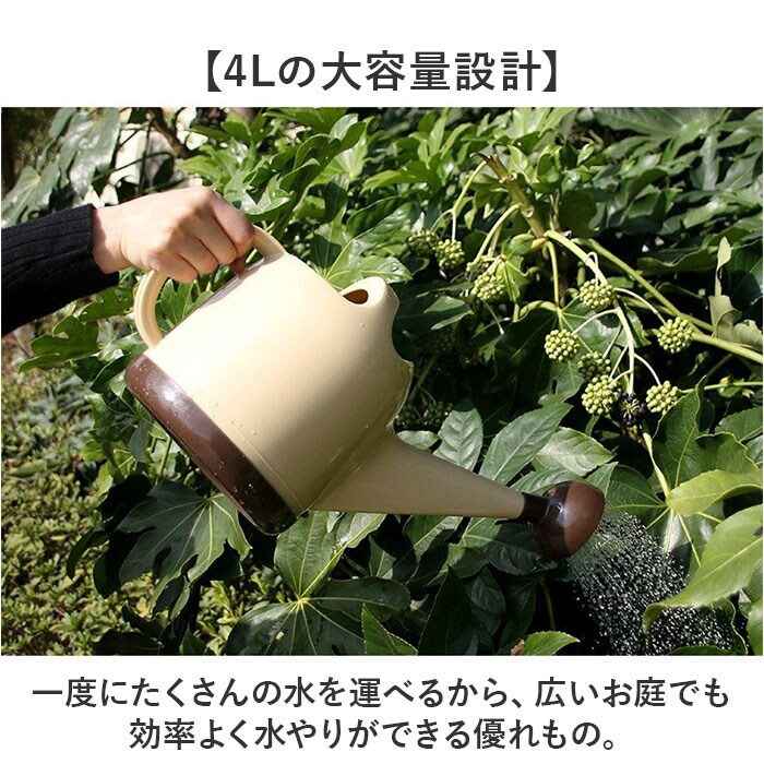 | 商品説明 | 【たっぷり入って楽ちん水やり】お庭の水やりが、もっと楽しく快適になる優秀ジョウロ。【4Lの大容量設計】一度にたくさんの水を運べるから、広いお庭でも効率よく水やりができる優れもの。【取り外し可能なヘッドで便利】シャワーヘッドが外せるので、細かい作業から大きな植物まで用途に合わせて使い分けOK♪【広口デザインで給水ラクラク】給水がスムーズにできる設計で、快適な使い心地〇【軽量プラスチックで持ちやすい】約419gの軽さと上部の持ち手で、女性でも楽々持ち運べる!【ちょうど良いサイズ感】ベランダや物置にもスマートに保管◎ |