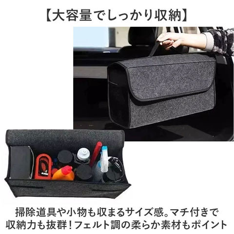 | 商品説明 | 【車内がスッキリ片付く!】車内のデッドスペースを有効活用できる、「車用収納ボックス 折りたたみ 持ち手付き」【大容量でしっかり収納】掃除道具や小物も収まるサイズ感。マチ付きで収納力も抜群!フェルト調の柔らか素材もポイント【折りたためる省スペース設計】使わないときはさっと折りたためてスッキリ。収納場所に困らない省スペース仕様。【出し入れ簡単な面ファスナー】片手でパッと開け閉めできる仕様。荷物の出し入れもスムーズ。持ち運びに便利な持ち手付き。【どこでも置ける汎用性の高さ】トランク、後部座席、足元などにフィット。どんな車にも合わせやすい万能サイズ。 |