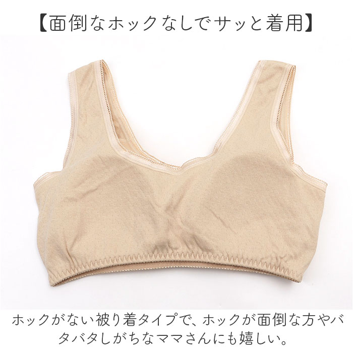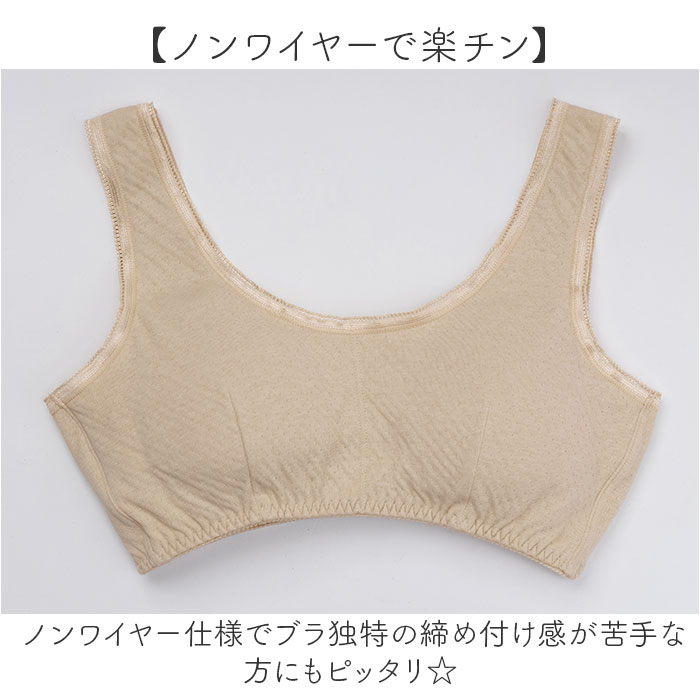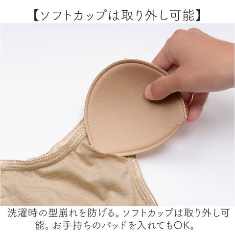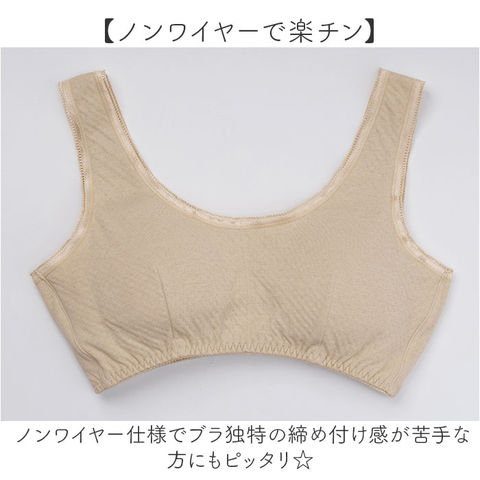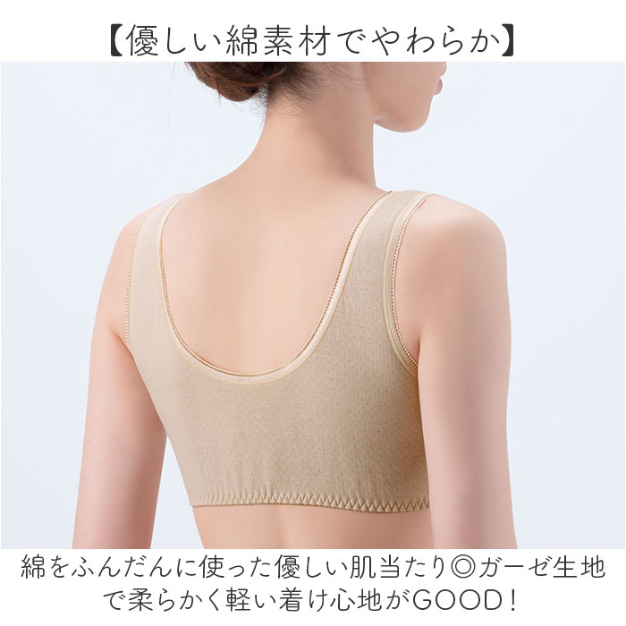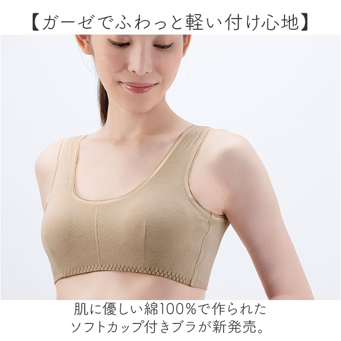 | 商品説明 | 【ガーゼでふわっと軽い付け心地】肌に優しい綿100%で作られたソフトカップ付きブラが新発売。【優しい綿素材でやわらか】綿をふんだんに使った優しい肌当たり◎ガーゼ生地で柔らかく軽い着け心地がGOOD!【素肌に当たってもチクチクナシ】素肌にチクチク刺激がない柔らかい生地感で、お肌が繊細な方にも安心。【ノンワイヤーで楽チン】ノンワイヤー仕様でブラ独特の締め付け感が苦手な方にもピッタリ☆【面倒なホックなしでサッと着用】ホックがない被り着タイプで、ホックが面倒な方やバタバタしがちなママさんにも嬉しい。【気になるくい込みやズレを軽減】肩紐部分は幅広い作りで肩へのくい込みやズレ落ちるのを軽減。【伸縮性に優れてフィット感あり】裾部分はゴム入りのギャザーで伸縮性があり自分サイズにフィット。【汗染みにも対応】前後左右高めの設計と、綿の吸水効果で汗を素早くキャッチし汗染みを防ぐ◎【夏でも蒸れにくい通気性】通気性もあり、夏のお出かけ時も汗で蒸れにくく快適に過ごせる。【ソフトカップは取り外し可能】洗濯時の型崩れを防げる。ソフトカップは取り外し可能。お手持ちのパッドを入れてもOK。【トップスに響きにくいカラー】淡色のトップスにも響きにくいベージュカラーなのも嬉しいポイント。 |