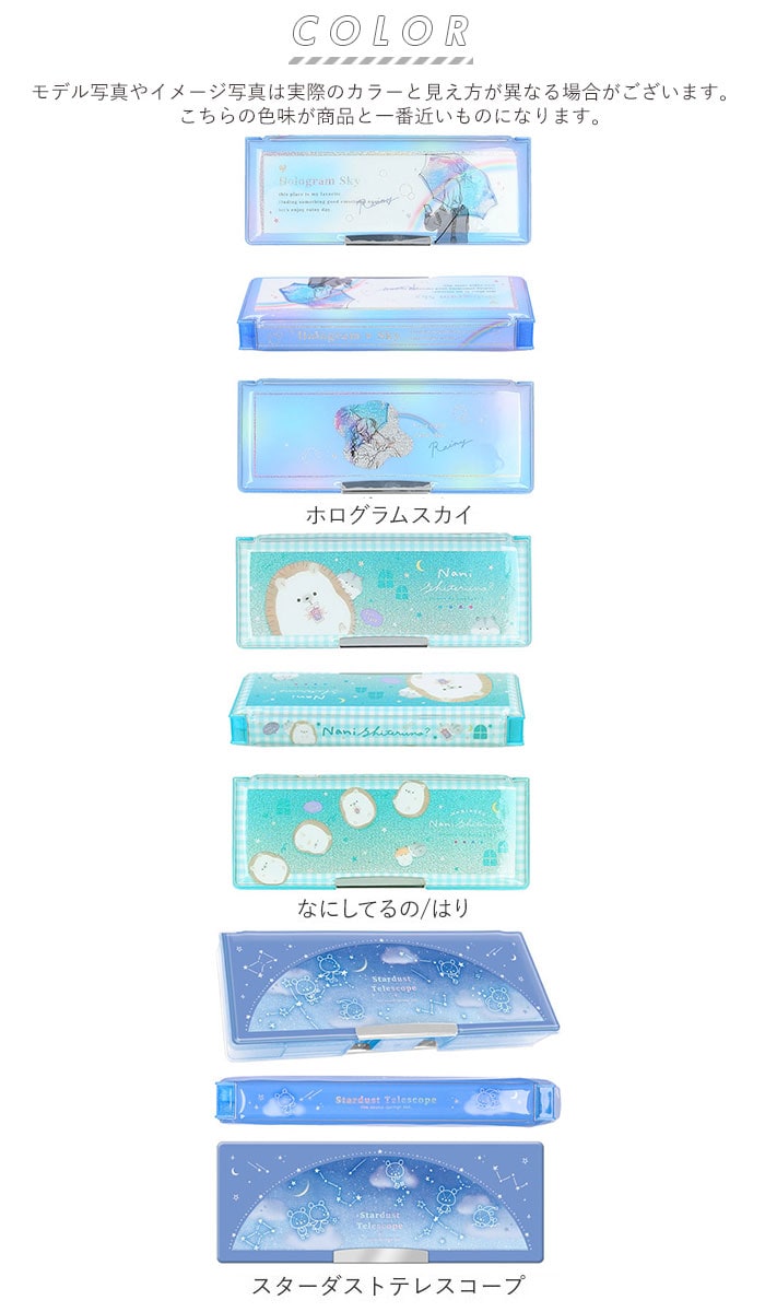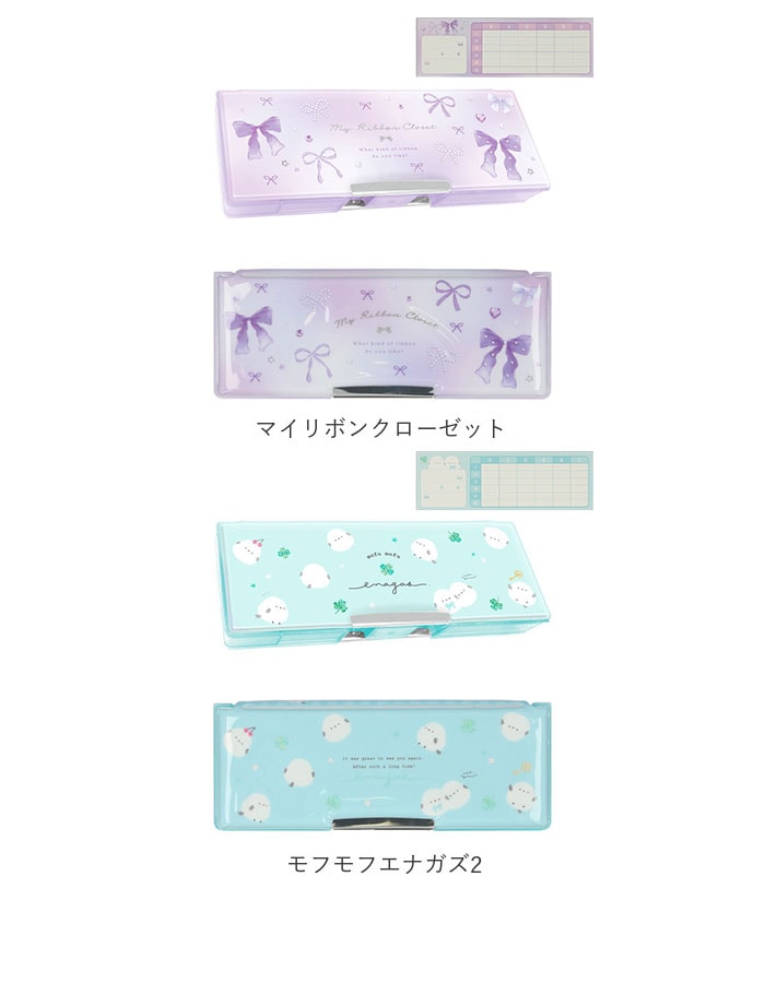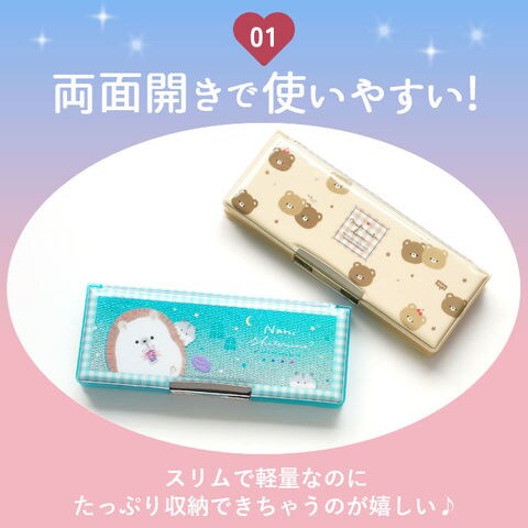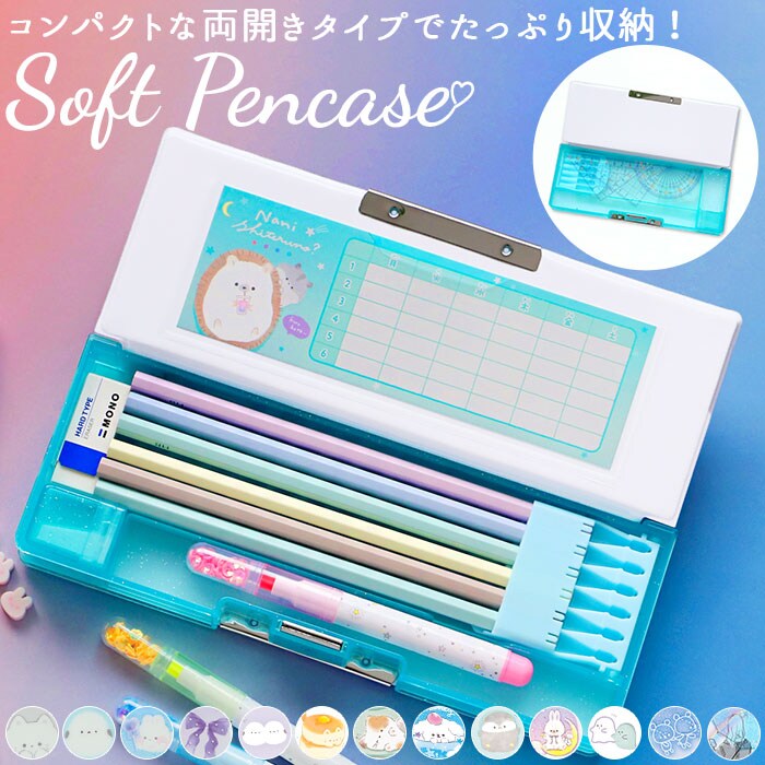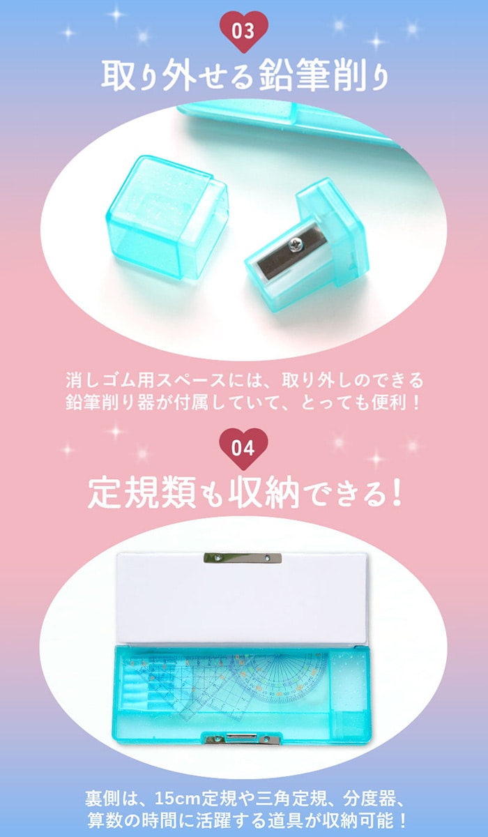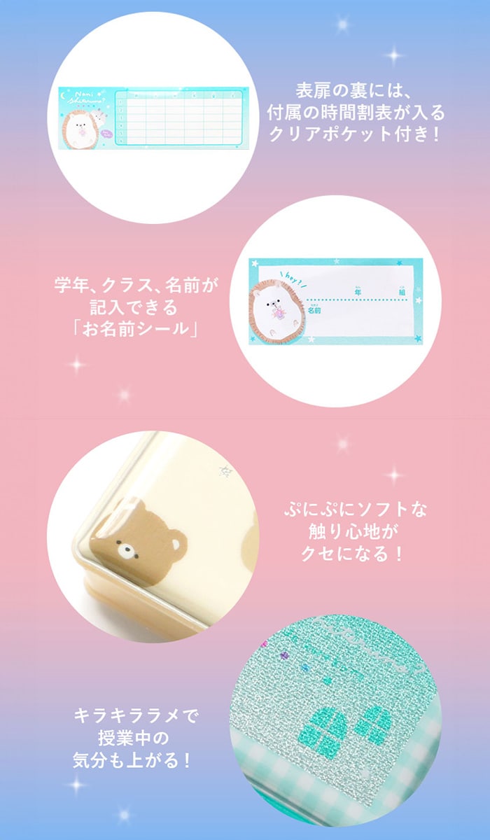 | 商品説明 | キラキラと華やかなラメ入りデザインが可愛い☆ぷにぷにの触り心地がクセになる、ソフトペンケース。両面開きで使いやすいボックス型筆箱。スリムで軽量なのにたっぷり収納できちゃうのが嬉しい♪オモテ側には、鉛筆6本・油性ネームペン・消しゴムが所定の位置にぴったりと収納可能。6本の鉛筆が収まるホルダーは可動式なので、取り出しがスムーズ。オモテ側の扉の裏には、付属の時間割表が入るクリアポケット付き!明日の授業に使う勉強道具の準備がラクラク。消しゴム用スペースには、取り外しのできる鉛筆削り器が付属していて、とっても便利!ウラ側には、15cm定規や三角定規、分度器など算数の時間に活躍する道具がすっきり収納できちゃう♪オモテ・ウラ、どちらの扉も、開閉が楽ちんなマグネット式。しっかり閉まるから、文房具がこぼれ落ちず安心。学年、クラス、名前が記入できる「お名前シール」が付属しているので、お友だちとお揃いのペンケースでも大丈夫♪ |