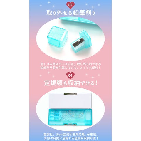 | 注意点 | ご使用の前に「取扱説明書」をよくお読みの上、正しくお使い下さい。鉛筆は削ったものを入れて下さい。鉛筆削りの削りカスは必ず捨ててから収納して下さい。消しゴムはサイズによっては入らないものもありますので、ご注意下さい。(消しゴムスペース:約H55×W33mm)落下などの衝撃により破損する恐れがあります。取り扱いには十分にご注意下さい。パーツが取れたり損傷や変質が生じた場合は使用しないでください。刃物がありますので怪我をしないよう十分に注意してご注意ください。通常サイズの鉛筆(直径約7.5mmくらい)をご使用ください。(サイズによっては入れづらい場合があります。)カメラやモニターの性質により、画像と実物の色の違いがある場合がございますのでご理解願います。 |