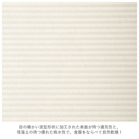 | 商品説明 | 保湿性や吸水性に優れ、呼吸する素材、珪藻土(けいそうど)を生かしたプロダクトで注目を集めるsoil(ソイル)。ナチュラルで自然の恵みを生かしたデザインが魅力のブランド。目の細かい波型形状に加工された表面が持つ通気性と、珪藻土の持つ優れた吸水性で、食器をならべて自然乾燥!soil(ソイル)ドライングボードライトL。内部に微細な孔が無数に開いた珪藻土ならではの多孔質構造で、吸水性はもちろん、消臭性や調湿性にも優れた素材。吸水した後、時間が経つと自然に乾燥。シンク脇の水切りバスケットに無造作に並べがちな食器類を、ドライングボードにスタイリッシュに並べれば、いつもの食器が素敵なインテリアの一部に。珪藻土が持つ自然そのままの柔らかなアイボリー色に、モノトーンの食器類や透明なグラスがマッチするシンプルさが魅力。大きめの食器や鍋も並べて置ける、ちょっと大き目Lサイズ。52.5cm×28.0cm。薄くて軽量なので、お手入れや収納の際も扱いやすい♪お手入れはとってもカンタン!風通しのよい場所で陰干しするだけ♪ |