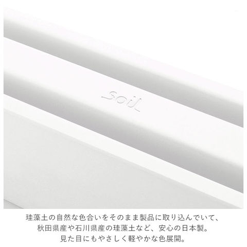 | 商品説明 | soil=「土 」。左官の技術や材料( 珪藻土)を用いてつくられたプロダクト。保湿性や吸水性に優れ、呼吸する素材としても注目される土の特性をそのままに、自然の恵みを凝縮させたナチュラルで心地のよいデザインが特徴。 皮膚の弱い方も安心して使用できて、リサイクル性にも富んでいる。吸水性の高い自然素材、珪藻土(けいそうど)でつくられたナイフトレー。最大刃渡り20cmの包丁を2本置くことが可能。珪藻土(けいそうど)とは…海や湖などに生息していた植物性プランクトン類が堆積物となり形成された地層から採取される。多孔質構造で、内部にマイクロメートル単位の微細な孔が無数にあいているので、吸水性や保湿性に優れ、消臭性や調湿性にも富んでいる。洗った後の水分をすばやく吸収してくれるので、そのまま置いて乾かせる!置き場に困るナイフや包丁を、安全かつおしゃれにしまえるのもポイント。溝の幅がしっかりあるので、出し入れもスムーズ。本体にしっかり重さがあり、ぐらつくこともなく安心。珪藻土の自然な色合いをそのまま製品に取り込んでいて、 秋田県産や石川県産の珪藻土など、安心の日本製。 見た目にもやさしく軽やかな色展開。 |