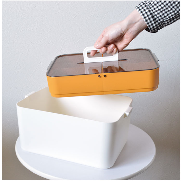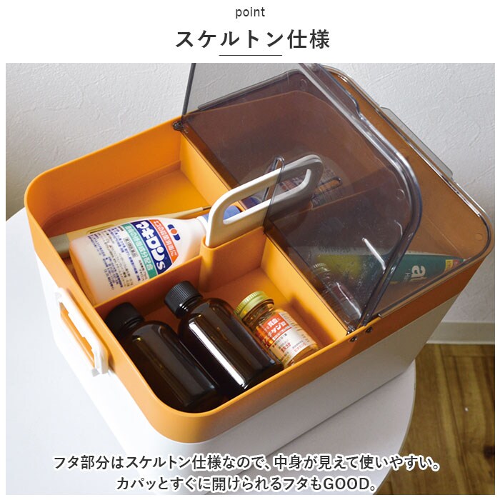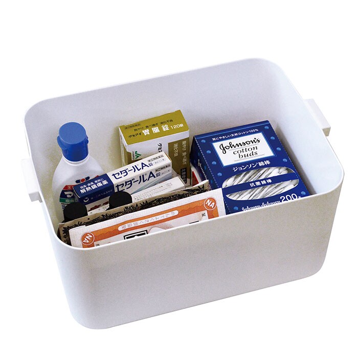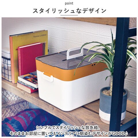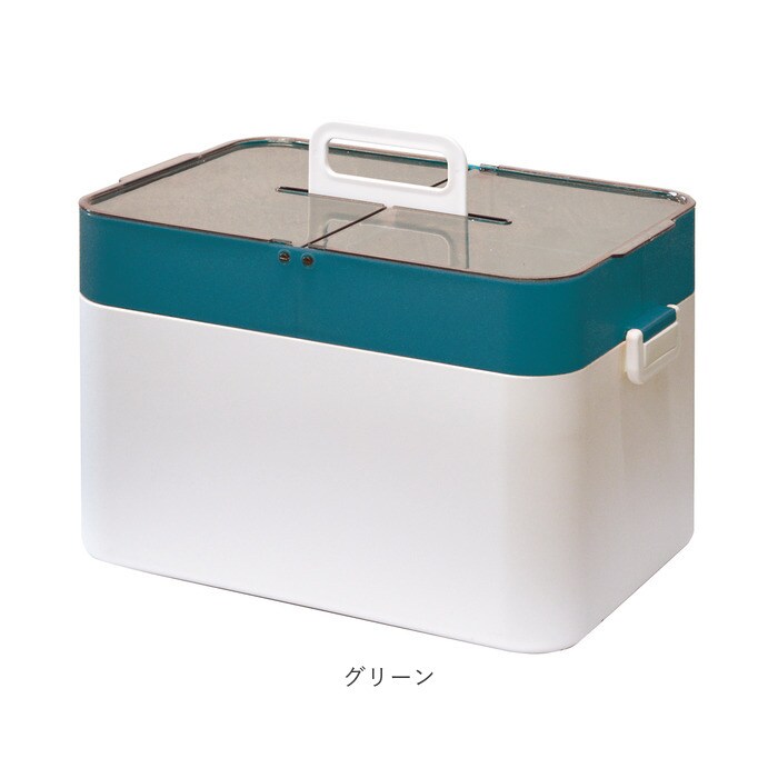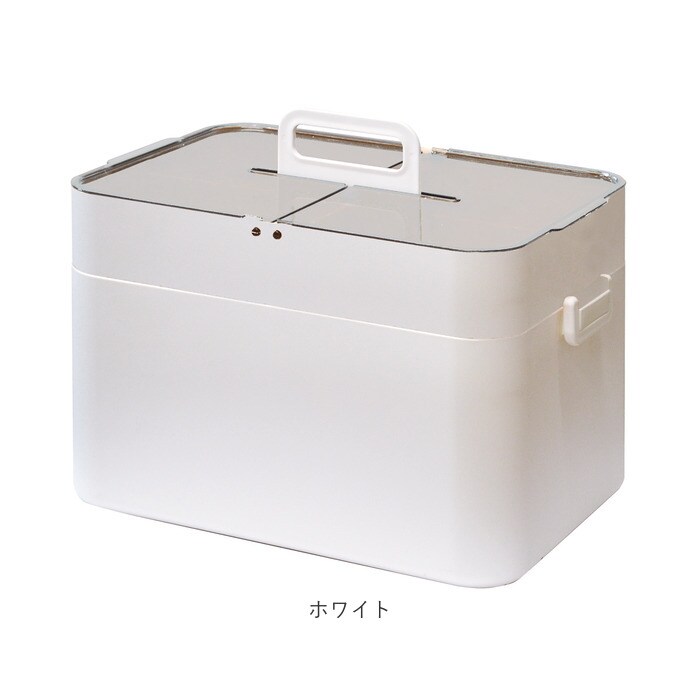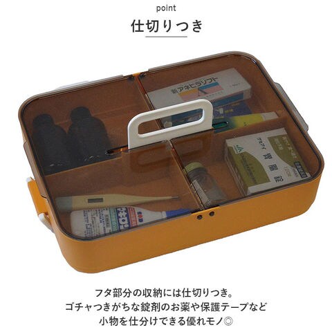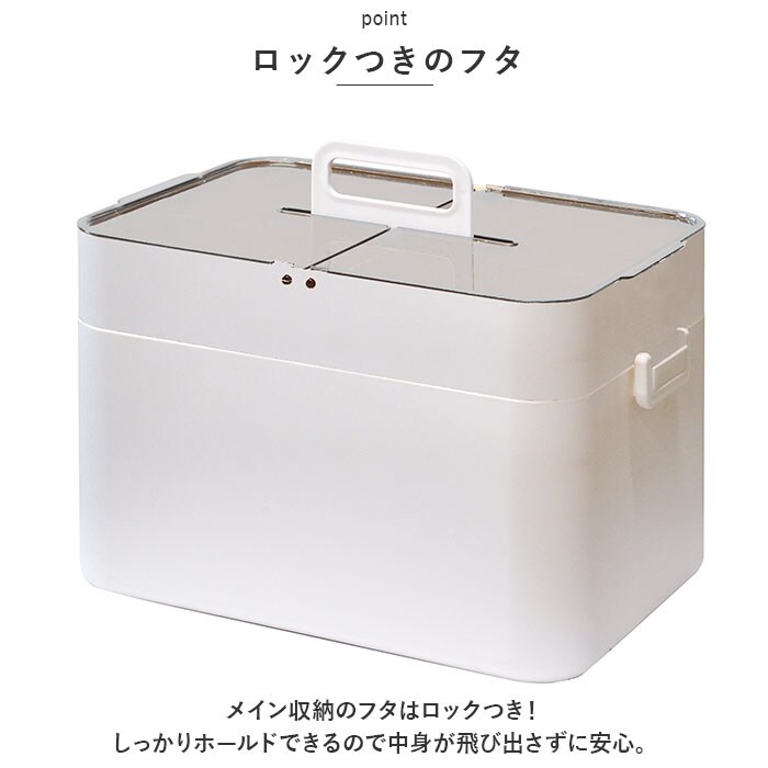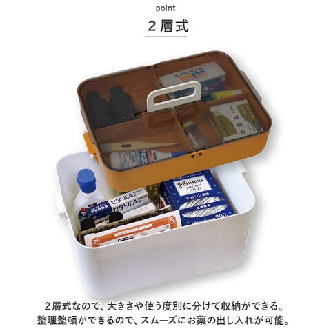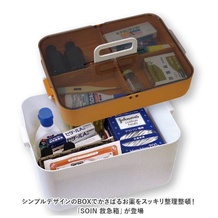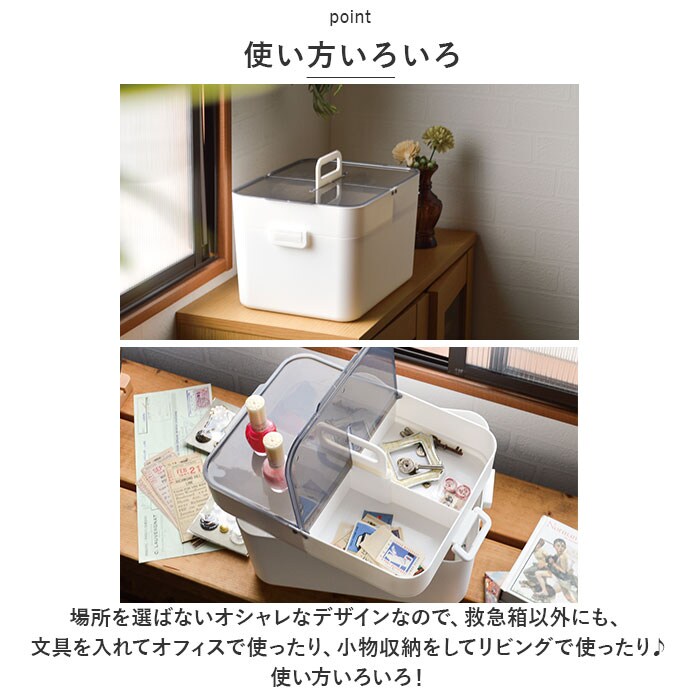 商品説明シンプルデザインのBOXでかさばるお薬をスッキリ整理整頓!「SOIN 救急箱」が登場【スタイリッシュなデザイン】シンプルでスタイリッシュな救急箱。そのままお部屋に置いてもインテリアに馴染むデザインがGOOD♪【2層式】2層式なので、大きさや使う頻度別に分けて収納ができる。整理整頓ができるので、スムーズにお薬の出し入れが可能。【仕切りつき】フタ部分の収納には仕切りつき。ゴチャつきがちな錠剤のお薬や保護テープなど小物を仕分けできる優れモノ◎【スケルトン仕様】フタ部分はスケルトン仕様なので、中身が見えて使いやすい。カパッとすぐに開けられるフタもGOOD。【ロックつきのフタ】メイン収納のフタはロックつき!しっかりホールドできるので中身が飛び出さずに安心。【取っ手つき】家中どこでも持ち運びができる取っ手つき。使いやすいこだわりポイントがたくさん!【使い方いろいろ】場所を選ばないオシャレなデザインなので、救急箱以外にも、文具を入れてオフィスで使ったり、小物収納をしてリビングで使ったり♪使い方いろいろ!