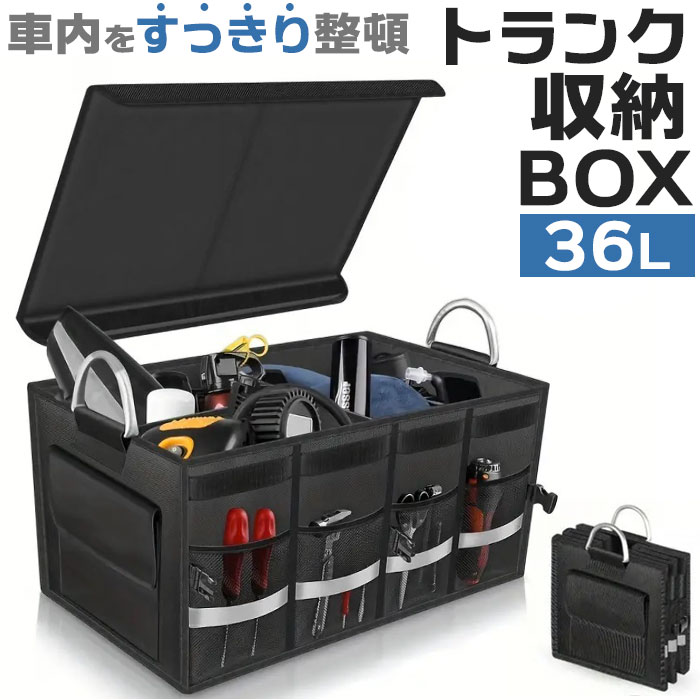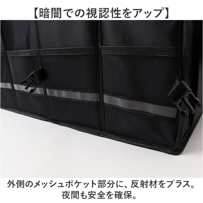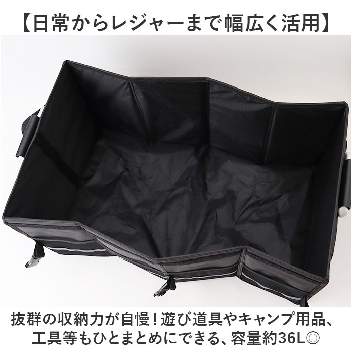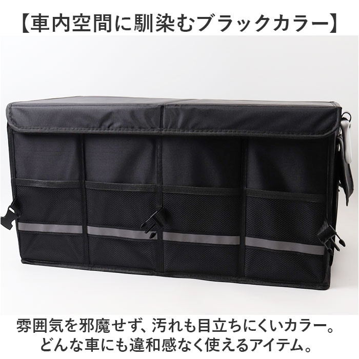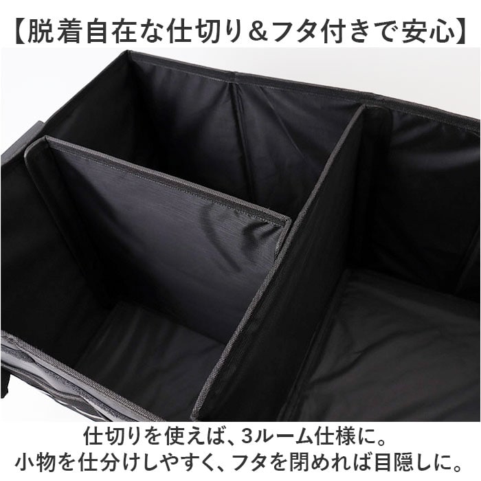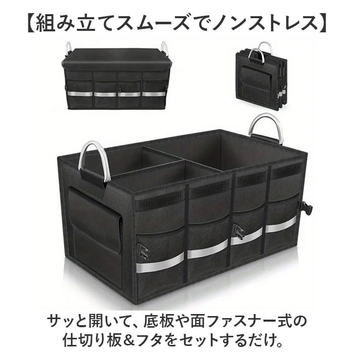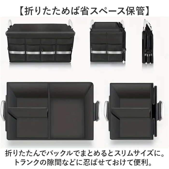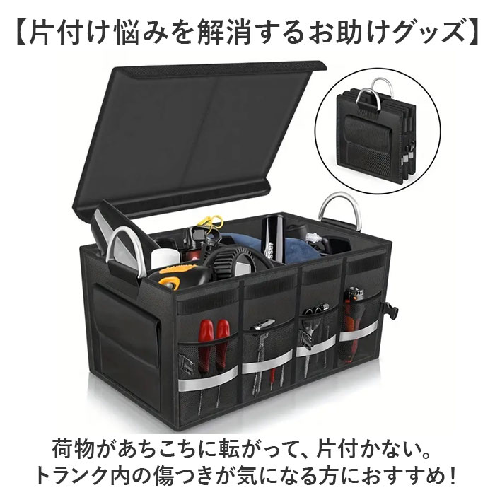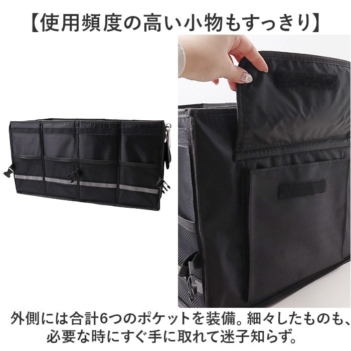 | 商品説明 | 【ごちゃつく車内をすっきり整頓】荷物をたっぷり収納できて、キレイに片付く◎「トランク収納ボックス」。【片付け悩みを解消するお助けグッズ】荷物があちこちに転がって、片付かない。トランク内の傷つきが気になる方におすすめ!【組み立てスムーズでノンストレス】サッと開いて、底板や面ファスナー式の仕切り板&フタをセットするだけ。【折りたためば省スペース保管】折りたたんでバックルでまとめるとスリムサイズに。トランクの隙間などに忍ばせておけて便利。【日常からレジャーまで幅広く活用】抜群の収納力が自慢!遊び道具やキャンプ用品、工具等もひとまとめにできる、容量約36L◎【脱着自在な仕切り&フタ付きで安心】仕切りを使えば、3ルーム仕様に。小物を仕分けしやすく、フタを閉めれば目隠しに。【安定感があり、持ち運びもラクラク】ボックスの形をキープする底板。両サイドに取っ手付きで、重たい荷物もスムーズに移動。【使用頻度の高い小物もすっきり】外側には合計6つのポケットを装備。細々したものも、必要な時にすぐ手に取れて迷子知らず。【丈夫でお手入れもラクラク】オックスフォード生地を採用、耐久性に優れたつくり。ガシガシ使えてお手入れも拭き取るだけ。【暗闇での視認性をアップ】外側のメッシュポケット部分に、反射材をプラス。夜間も安全を確保。【車内空間に馴染むブラックカラー】雰囲気を邪魔せず、汚れも目立ちにくいカラー。どんな車にも違和感なく使えるアイテム。【ポケット仕様】外側:メッシュポケット×4、面ファスナー式フラップポケット×2 |