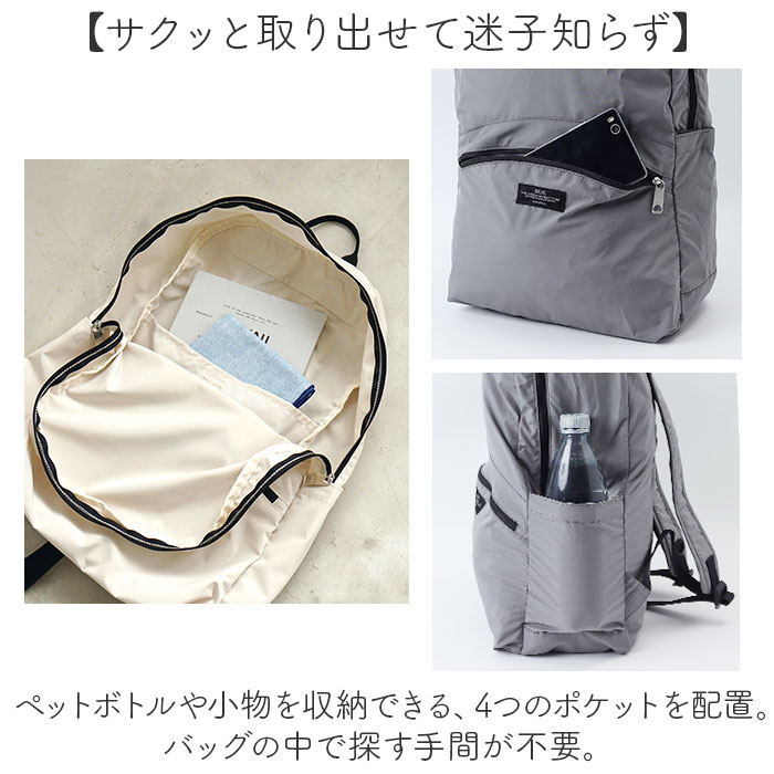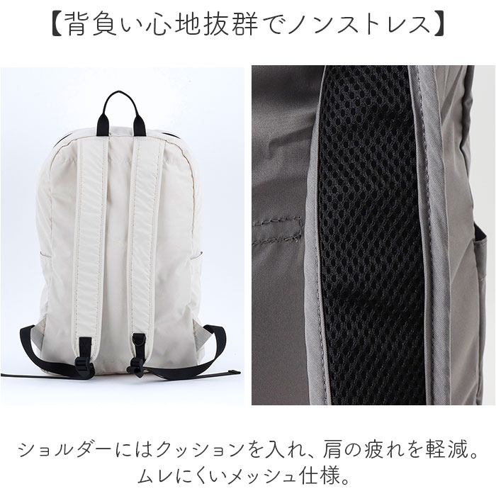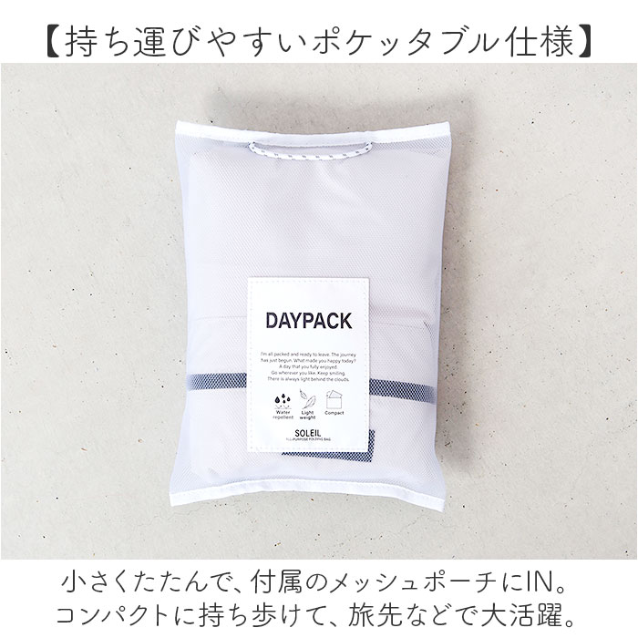 | 商品説明 | 【週末の楽しいお出掛けをサポート】色んな予定の詰まった、週末のお供に☆「SOLEIL ウィークエンドデイパック」。【いつだって味方!ヘビロテ確定】負担をかけない軽量設計。程よい収納力で、お子様の行事やアウトドア、デイリー使いもお任せ!【持ち運びやすいポケッタブル仕様】小さくたたんで、付属のメッシュポーチにIN。コンパクトに持ち歩けて、旅先などで大活躍。【ガバっと開くダブルファスナー】左右どちらからもオープン。中身を確認しやすく、荷物の出し入れがスムーズ。【A4対応ですっきりひとまとめ】A4がすっぽり。薄手の着替えやポーチなども入る容量約13L、耐荷重は約8kg。【サクッと取り出せて迷子知らず】ペットボトルや小物を収納できる、4つのポケットを配置。バッグの中で探す手間が不要。【背負い心地抜群でノンストレス】ショルダーにはクッションを入れ、肩の疲れを軽減。ムレにくいメッシュ仕様。【ちょっとの雨なら大丈夫】生地には水滴や汚れを弾く、撥水加工済み。屋外でのアクティブシーンで重宝。(※)完全防水ではありません。【お手入れ簡単!ウォッシャブル仕様】汚れが気になったら、自宅で手洗い可能!いつも清潔をキープ。【リュックを掛けたり便利な持ち手】持ち手を使って、フックなどに掛けておける!リュックを下ろすシーンでも便利。【お揃いOK☆ユニセックスデザイン】カジュアルスタイルにマッチ。年代や性別問わず持てるカラーで、お揃いやシェアも!【ポケット仕様】内側:面ファスナー式ポケット×1前面:ファスナーポケット×1サイド:面ファスナー式ポケット×2 |