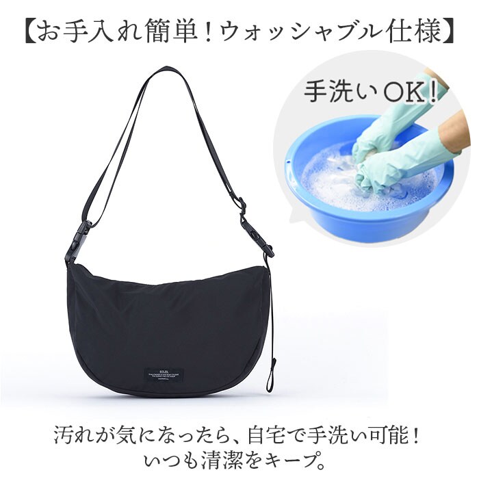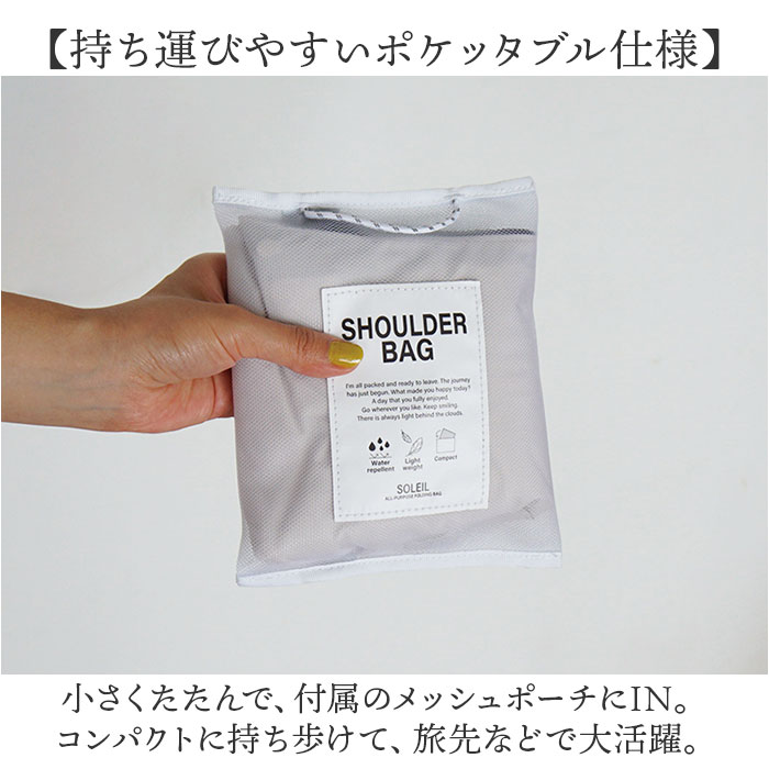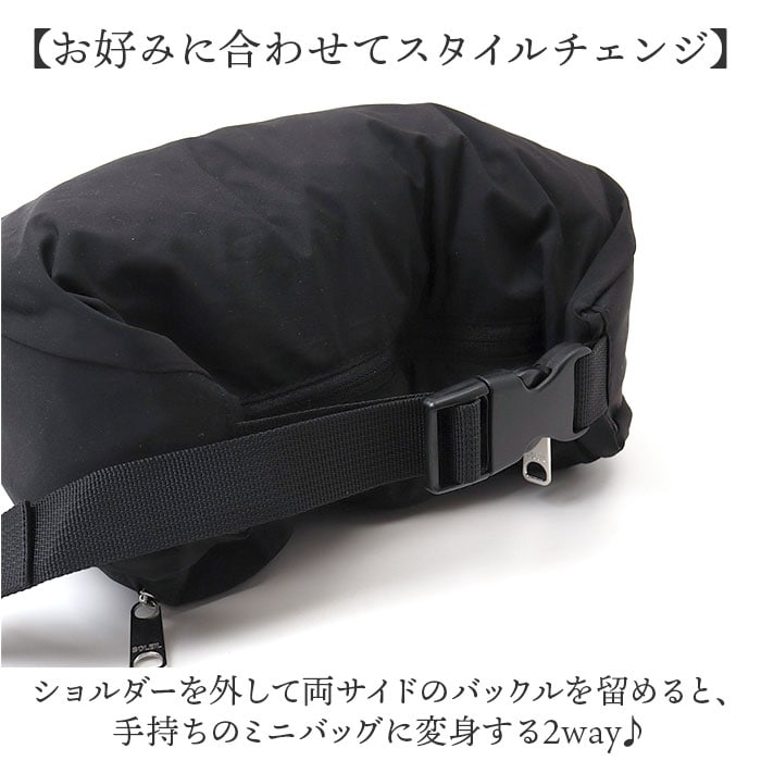 | 商品説明 | 【週末の楽しいお出掛けをサポート】旅行やレジャーなど、週末の予定のお供に☆「SOLEIL ウィークエンドショルダー」。【メインもサブ使いもできて万能】身軽に動ける軽量設計。これ1つで散策などはもちろん、貴重品を入れるサブバッグとしても!【持ち運びやすいポケッタブル仕様】小さくたたんで、付属のメッシュポーチにIN。コンパクトに持ち歩けて、旅先などで大活躍。【両手が空いて移動がラクラク】ショルダーの長さを調節して、肩掛けや斜め掛け。アクティブシーンでも快適。【お好みに合わせてスタイルチェンジ】ショルダーを外して両サイドのバックルを留めると、手持ちのミニバッグに変身する2way♪【開閉スムーズ、安心のファスナー式】ガバっと開いて取り出しやすく、ファスナーを閉じれば中身の飛び出しをガード。【マストアイテムをひとまとめ】お財布やミニボトル、エチケットグッズが入る容量約3Lサイズ。耐荷重は4kg。【サクッと取り出せて迷子知らず】合計2つのポケットを配置。バッグの中で小物を探す手間が不要。【ちょっとの雨なら大丈夫】生地には水滴や汚れを弾く、撥水加工済み。アウトドアなどでも重宝。(※)完全防水ではありません。【お手入れ簡単!ウォッシャブル仕様】汚れが気になったら、自宅で手洗い可能!いつも清潔をキープ。【お揃いOK☆ユニセックスデザイン】カジュアルスタイルにマッチ。年代や性別問わず持てるカラーで、お揃いやシェアも!【ポケット仕様】内側:面ファスナー式ポケット×1背面:ファスナーポケット×1 |