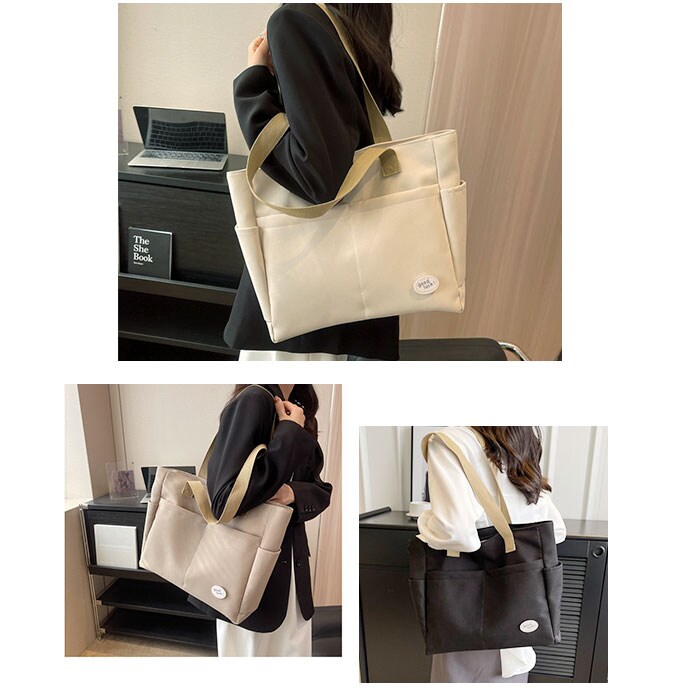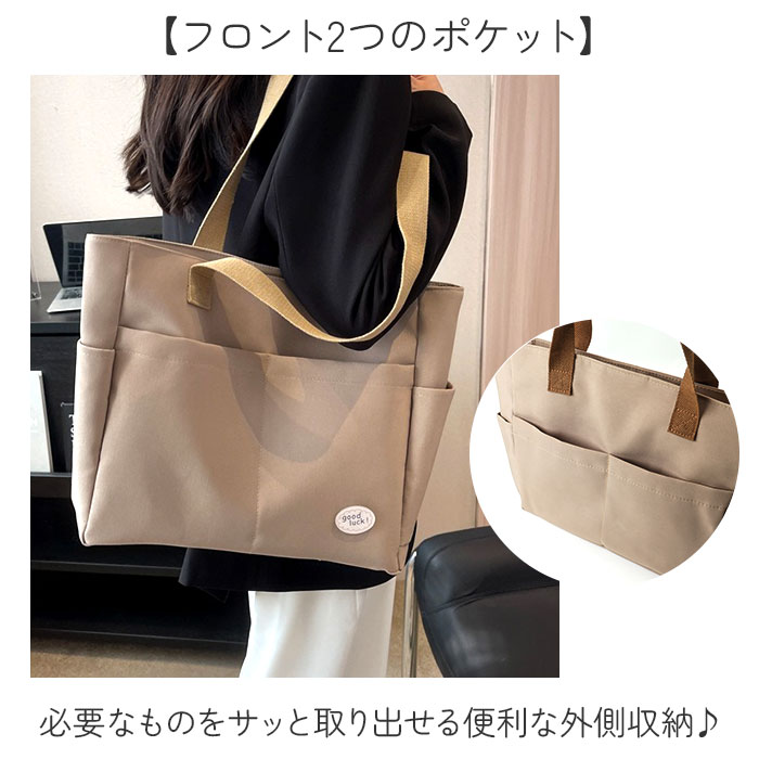 | 商品説明 | 【毎日使える万能バッグ】軽量で収納力抜群、通勤からカジュアルまで活躍するトートバッグ。【A4サイズもすっぽり】書類やタブレットもラクラク収納できる大容量サイズ◎【フロント2つのポケット】スマホや小物をサッと取り出せる便利な外側収納♪【サイド両側にも配置】ペットボトルや折り畳み傘を入れられる機能的設計。【内側ポケットで整理】小物を収納できる内ポケット付きデザイン〇【取り外せるバッジ付き】気分に合わせてカスタマイズできるアクセサリー付き。 |