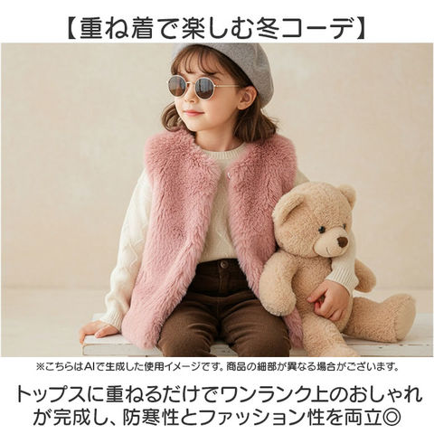 | 商品説明 | 【もこもこ可愛い冬ベスト】ふわふわフェイクファーで女の子を暖かく包むファーベスト。【重ね着で楽しむ冬コーデ】トップスに重ねるだけでワンランク上のおしゃれが完成し、防寒性とファッション性を両立◎【もこもこの温かさ】ふわふわのフェイクファーが寒い季節からやさしく守り、冬のお出かけを快適にしてくれる♪【フックで簡単着脱】フロント部分は引っ掛けるだけのフック仕様で、小さなお子様でも自分で着脱しやすい! |