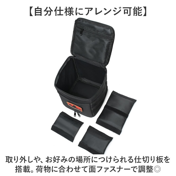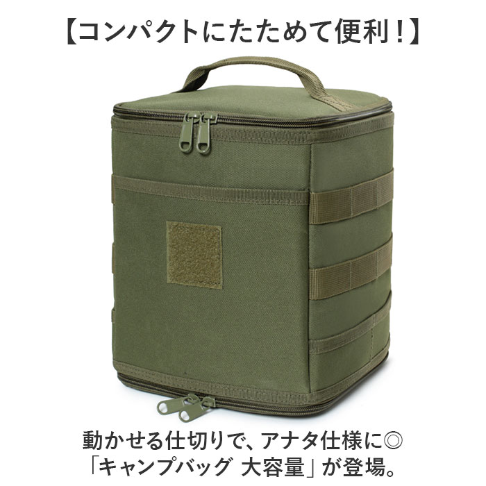| 商品説明 | 【コンパクトにたためて便利!】動かせる仕切りで、アナタ仕様に◎「キャンプバッグ 大容量」が登場。【あらゆるキャンプグッズを収納】ランタン、ガスタンク、コンロ、LEDライト、シェラカップなど。必要な小物をすっぽり収納。【持ち運びに便利な折りたたみ式】ファスナーを開け、パタッと折りたためばコンパクトに。使わない時も置き場所をとらない。【自分仕様にアレンジ可能】取り外しや、お好みの場所につけられる仕切り板を搭載。荷物に合わせて面ファスナーで調整◎【汚れに強い撥水生地を採用】屋外での使用にぴったりな、撥水生地。突然の雨でも安心&汚れにも強い!※完全防水ではありません。【しっかり自立するから使いやすい】型崩れがしにくい、硬めの作り。バッグが自立するから扱いやすく、長く愛用できる。【外側ポケット&ベルトつき】外側にはオープンポケットと、小物を引っかけられるベルトつき。使い勝手良し◎ |
