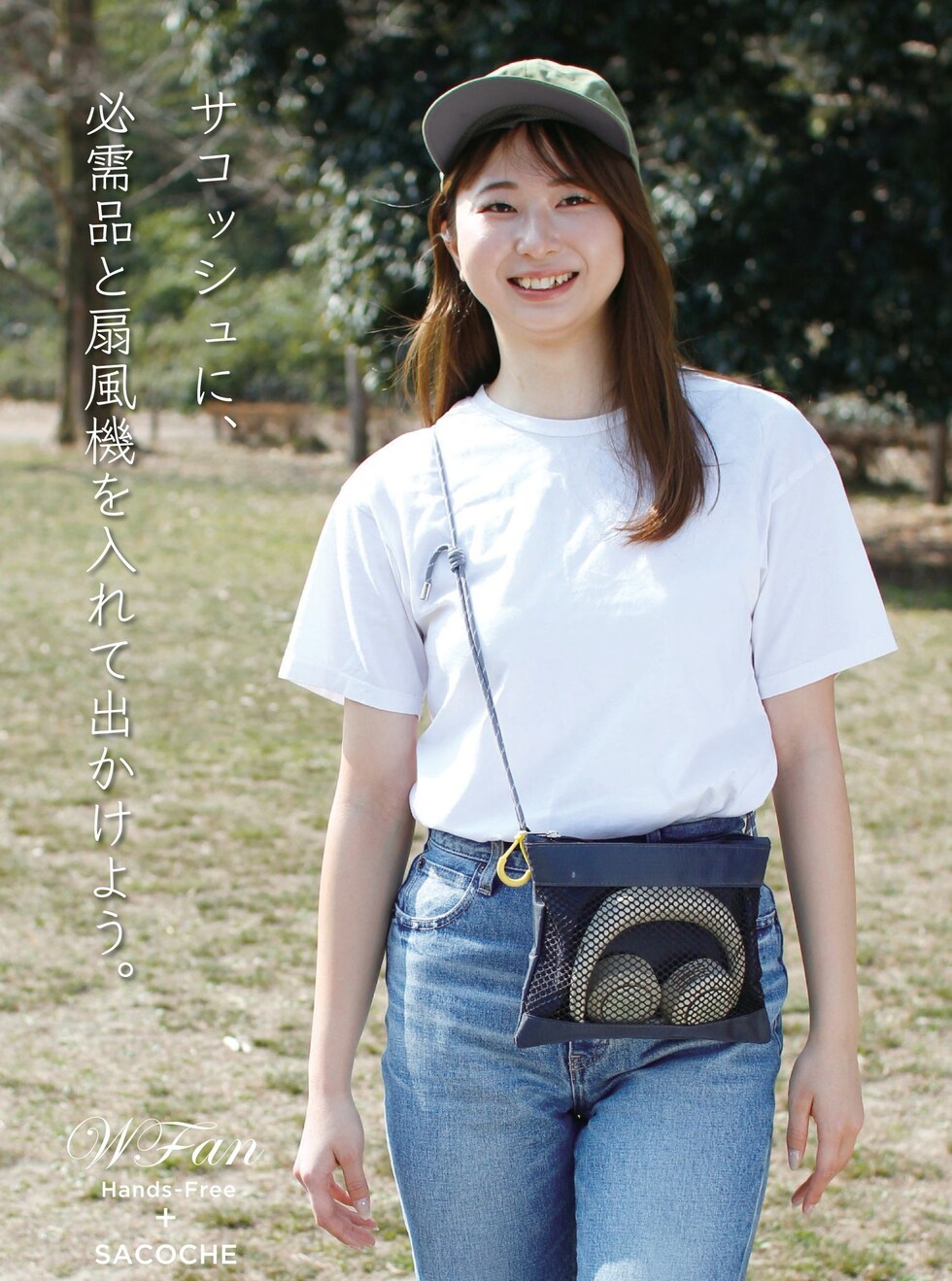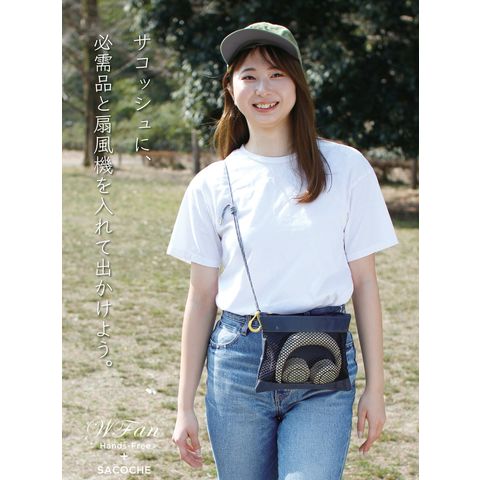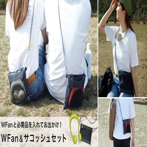 | 商品説明 | 暑い時、暑い場所でいつでもどこでも、首にかけるだけの携帯用扇風機WFanを持ちあるけるようサコッシュにセット。メッシュ素材のポケットにWFanを入れて使いたい時にすぐに取り出せ、貴重品なども入れられるように背面ポケットはファスナー付き。WFanをコンパクトに収納できるので、旅行やフェスなどのお出かけに便利。WFanはシロッコファンを採用し、扇風機に見えないおしゃれなフォルムと静音性を実現しました。パワフルな風はそのままに、首にフィットするように小さめのネックラインになりました。屋外の風の影響を受けにくいシロッコファンは、髪の毛も巻き込みにくく、音が静かです。空気を送り出す力が強いので、送風口がコンパクトでも充分な風量です。持つ必要がないので、手が自由になり快適に使用できます。ファンに繋がるアームは、上にむけたり左右へ最大180度お好みの方向にすることが出来ます。屋外はもちろん、インドアでもより快適に使いやすいよう5段階の細かな風力調整が可能になりました。側面スイッチで電源を入れ、押すごとにリズム(自然の風のように強弱)→微風→弱風→中風→強風→OFFと切り替わります。約260gと軽量なので首への負担がありません。環境を考えたニッケル水素電池内蔵で、簡単で便利なUSBポートから充電。面倒な電池交換は不要。フル充電で最大約10時間連続使用ができます。(リズム/約350分 微風/約650分 弱風/約340分 中風/約230分 強風/約130分)真夏のフェスやアウトドア、スポーツ観戦、散歩、山登り、遠足、お祭りや日常生活でのガーデニング、お風呂上り、お化粧時、家事の時、通勤、通学、オフィスなどあらゆる場面で活躍 |