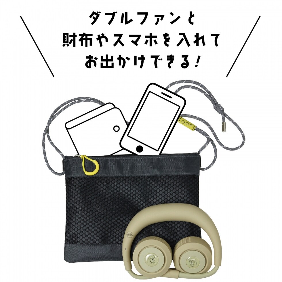 | サイズ | サコッシュ:[縦]約19cm/[横]約27cm/[厚さ]約1cm 持ち手[長さ]75~150cm(調整可能)ダブルファン:[縦]約25cm/[横]約16cm/[ファンの直径]約6cm[USBケーブルの長さ]約61cm |