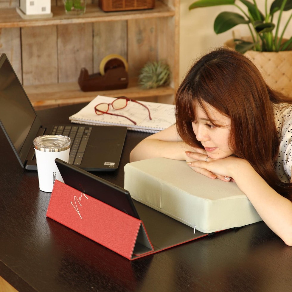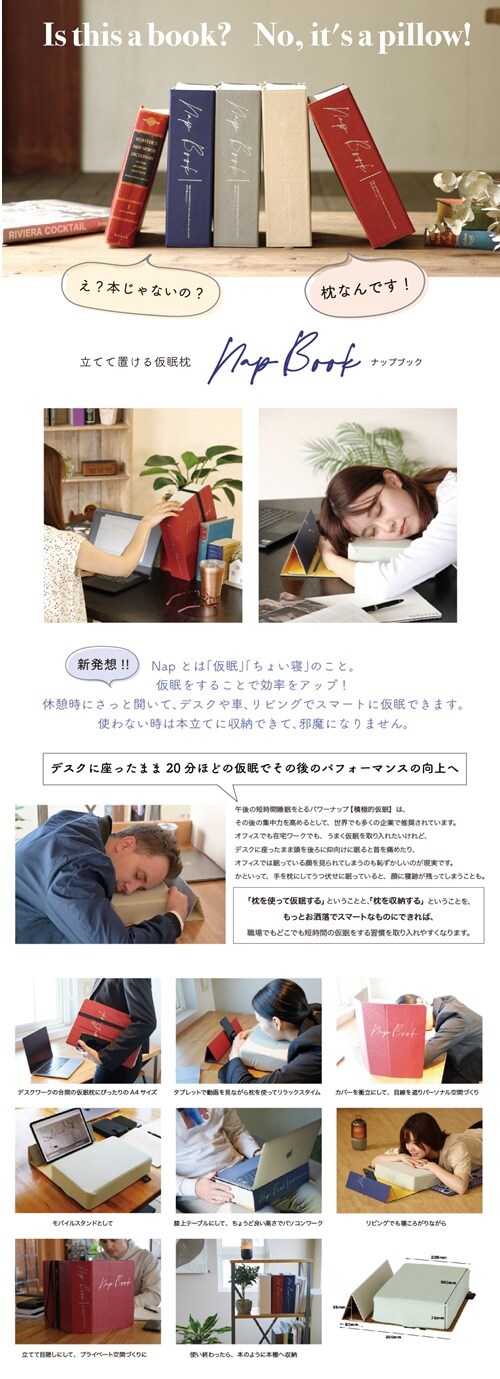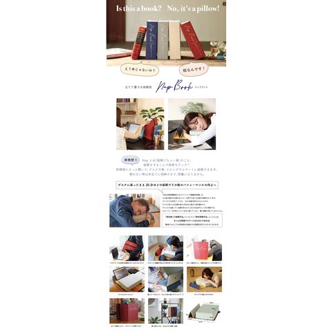 | 商品説明 | 仕事や勉強の合間や昼食後などの休憩時に、ちょっと仮眠してみたものの逆に体勢が悪くて辛くなった経験はありませんか?さっと取り出して気持ちよく仮眠するための枕で、しっかり短時間睡眠をしてその後のパフォーマンスを向上。本のように立てて収納できるので、使いたい時にさっと取り出せ、使用後も置き場に困らず仮眠をスマートに習慣化しやすくなります。カバーの中にはふっくら柔らかい低反発の枕がセットされており、取り外しも自由。そのまま使ってもいいし、カバーを外して衝立てにすることで寝顔を隠せて落ち着いて仮眠ができます。気持ちよい柔らかさのクッションと肌触りで顔に寝跡がつく心配はありません。クッションカバーは汚れたら取り外して手洗いできます。枕本体は日陰干ししてください。カバーを内側に三角に折畳んで固定すれば、モバイルスタンドにもなります。枕として使用する以外に、閉じた状態で膝上簡易テーブルとしてもちょうどよい大きさで便利です。13インチ程度までのパソコンを使うのに最適です。 |