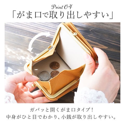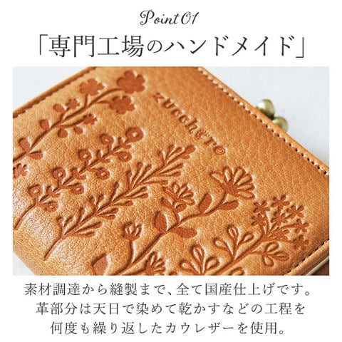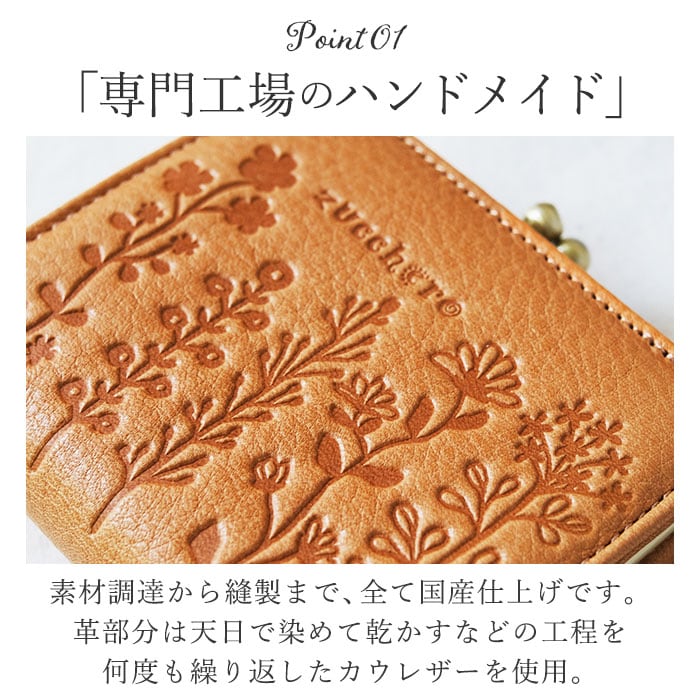 | 商品説明 | お財布専門工場で制作!使い込む程に手になじむ2つ折りがま口財布が登場。【zucchero/ズッケロシリーズ】主な素材にナチュラルレザーを使用したライン。ナチュラルレザーならではのテイストと、現代的なスパイスを取り入れたカジュアルさを両立。【本革仕様】国産の原皮をタンニンで鞣し、アニリンベースでツヤが引き立つ仕上げをした革を使用。綺麗なツヤの中にも深い色味が楽しめる。【可愛らしいフォルム】シックできれいめな印象のお財布ですがコロンとした可愛らしい形。使い込むほどに手に馴染む。【小銭入れ】がま口タイプの小銭入れ。大きく開きくので、小銭が見やすく取り出しやすい。【充実したポケット】内側のカード入れも充実した造り。デザインだけでなく使い勝手にも優れたお財布に仕上げている。【ポケット仕】カード入れ×6、お札入れ×1、小銭入れ×1 |
