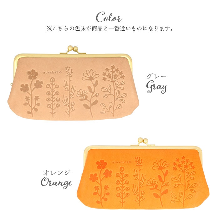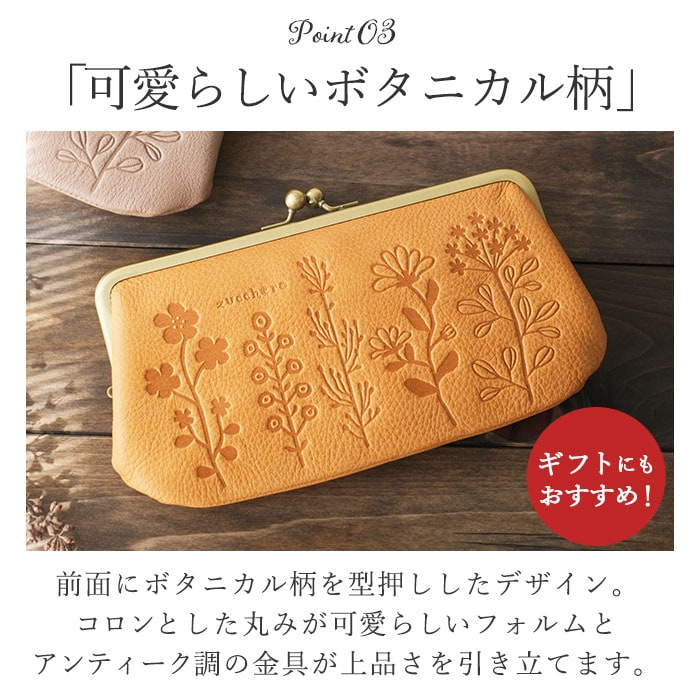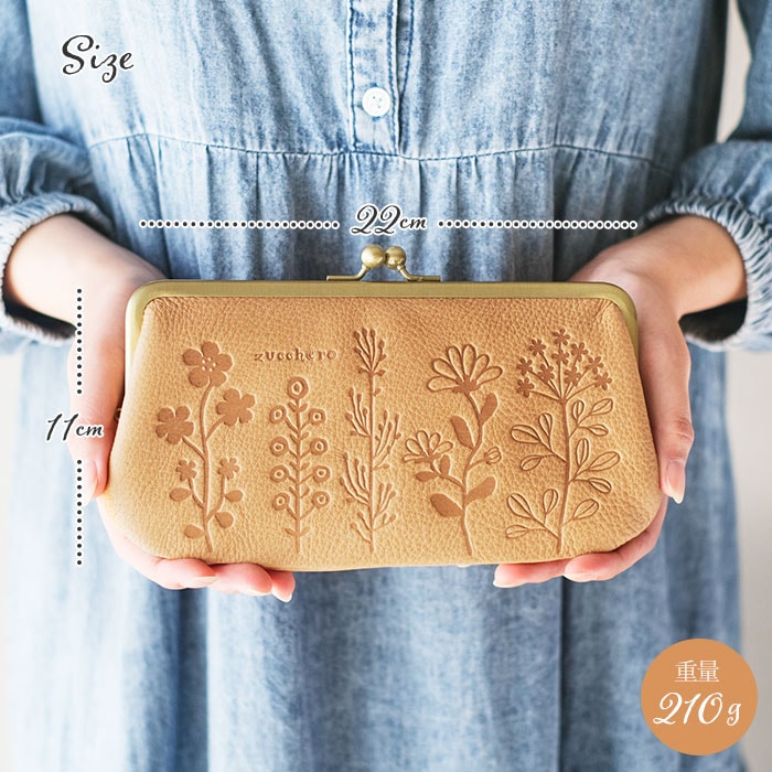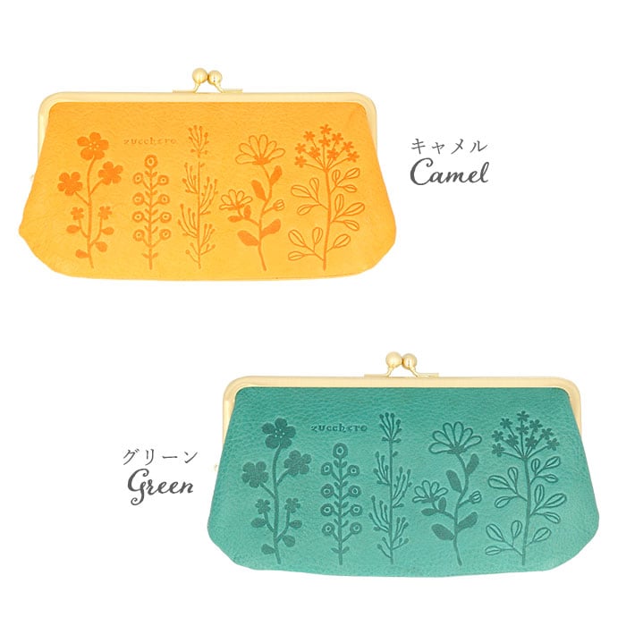 商品説明サライから、前面に花柄を型押ししたデザインが素敵なガマ口財布が登場。【zucchero/ズッケロ】主な素材にナチュラルレザーを使用したライン。ナチュラルレザーならではのテイストと、現代的なスパイスを取り入れたカジュアルさを両立。【花柄の型押しデザイン】様々な花柄を型押ししたシリーズ。革は握るとキュッキュッとなる通称「鳴き革」という特徴のあるオイルシュリンクレザーを使用。前面のオシャレな型押しの花柄とブランドロゴが目を引く新しいデザインのガマ口財布に仕上げました。【がま口タイプ】人気の親子がま口仕様。親子がま口部分は、間に仕切りがあり整理しながら収納可能。お札が取り出しやすく、ポケット機能も充実しているので使い勝手がよい。【国産】素材・縫製全て、国産にこだわって作った一品。【ポケット仕様】カード入れ×12、お札入れ×2、小銭入れ×1、フリーポケット×2