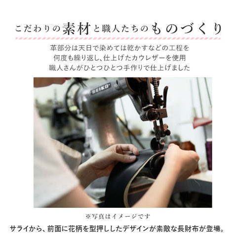 | 商品説明 | サライから、前面に花柄を型押ししたデザインが素敵な長財布が登場。【zucchero/ズッケロ】主な素材にナチュラルレザーを使用したライン。ナチュラルレザーならではのテイストと、現代的なスパイスを取り入れたカジュアルさを両立。【花柄の型押しデザイン】様々な花柄を型押ししたシリーズ。革は握るとキュッキュッとなる通称「鳴き革」という特徴のあるオイルシュリンクレザーを使用。前面のオシャレな型押しの花柄とブランドロゴが目を引く新しいデザインの長財布に仕上げました。【L字ファスナー】使い勝手の良いL字型ファスナーのお財布。通常のサイズ感よりコンパクトにした、手にフィットするサイズ感。小銭入れにはファスナーがなく、お札入れも大きく開くので、会計時もスムーズにお支払いできる。【国産】素材・縫製全て、国産にこだわって作りました。【ポケット仕様】メイン:カード入れ×8、お札入れ×2、小銭入れ×1、フリーポケット×1背面:ファスナーポケット×1 |
