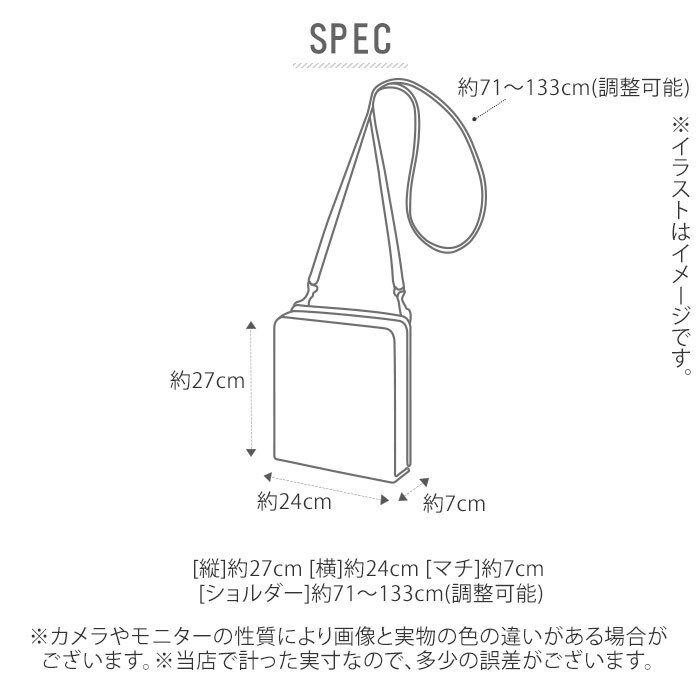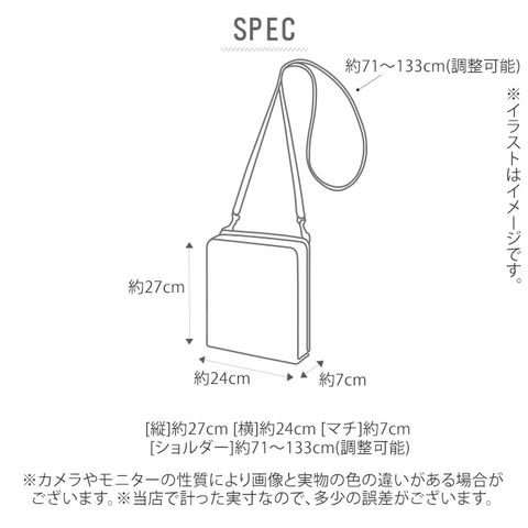 | サイズ | [縦]約27cm/[横]約24cm/[マチ]約7cm [ショルダー]約71cm~約133cm(調整可能) ※サイズは当店平置き実寸サイズです。実際の商品とは多少の誤差が生じる場合がございます。あらかじめご了承ください。 |