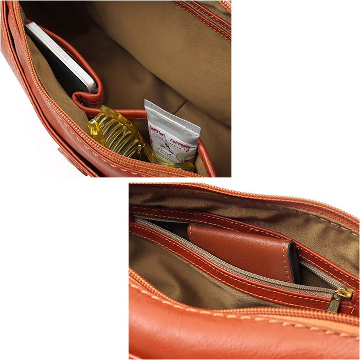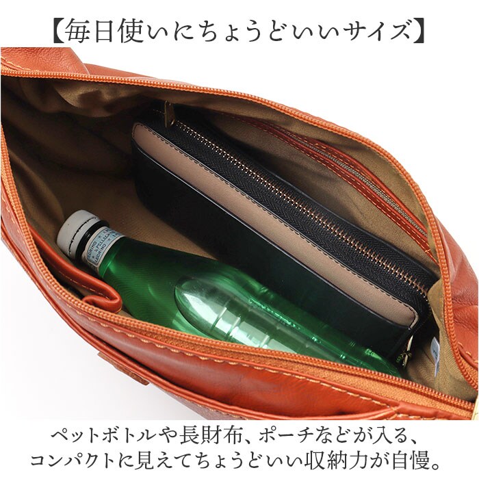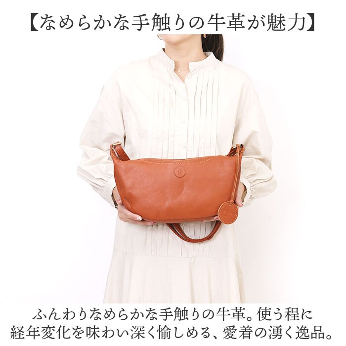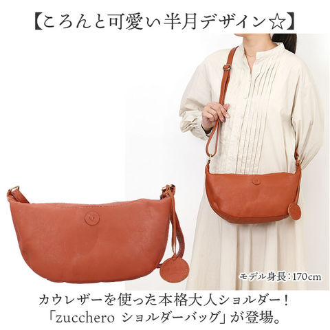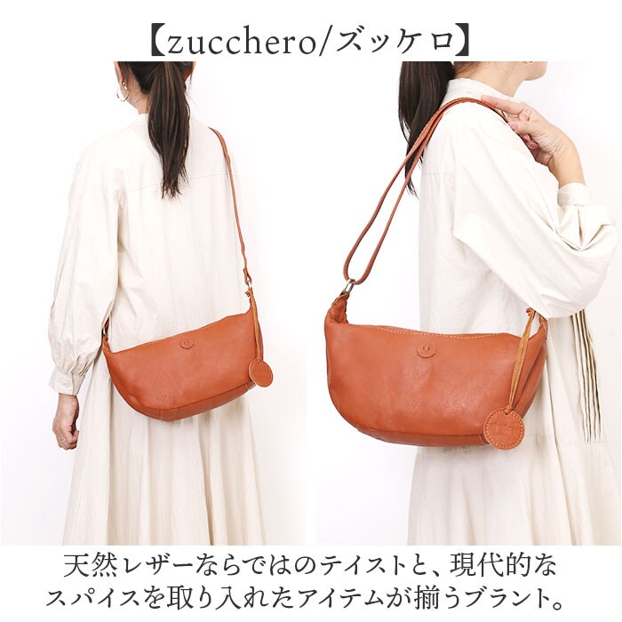 商品説明【ころんと可愛い半月デザイン☆】カウレザーを使った本格大人ショルダー!「zucchero ショルダーバッグ」が登場。【zucchero/ズッケロ】天然レザーならではのテイストと、現代的なスパイスを取り入れたアイテムが揃うブラント。【なめらかな手触りの牛革が魅力】ふんわりなめらかな手触りの牛革。使う程に経年変化を味わい深く愉しめる、愛着の湧く逸品。【ころんとナチュラルな可愛さ!】丸っこい半月デザインに癒される♪目を惹くボタンのアクセントは、同色で仕上げ優しい印象に♪【フロントポケットで便利さUP】外側ポケットには、使用頻度の高い小物を収納できる。サッと取り出しOKで、使いやすい◎【毎日使いにちょうどいいサイズ】ペットボトルや長財布、ポーチなどが入る、コンパクトに見えてちょうどいい収納力が自慢。【嬉しい刻印プレートつき☆】さりげないアクセントの、zucchero刻印のプレート。ブランドロゴのおしゃれさが素敵♪【ポケット仕様】メイン収納:ファスナーポケット×1、オープンポケット×2フロント:オープンポケット×1