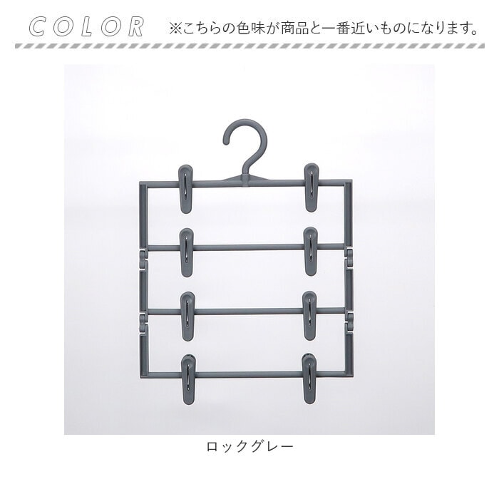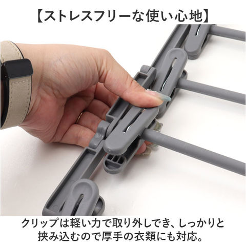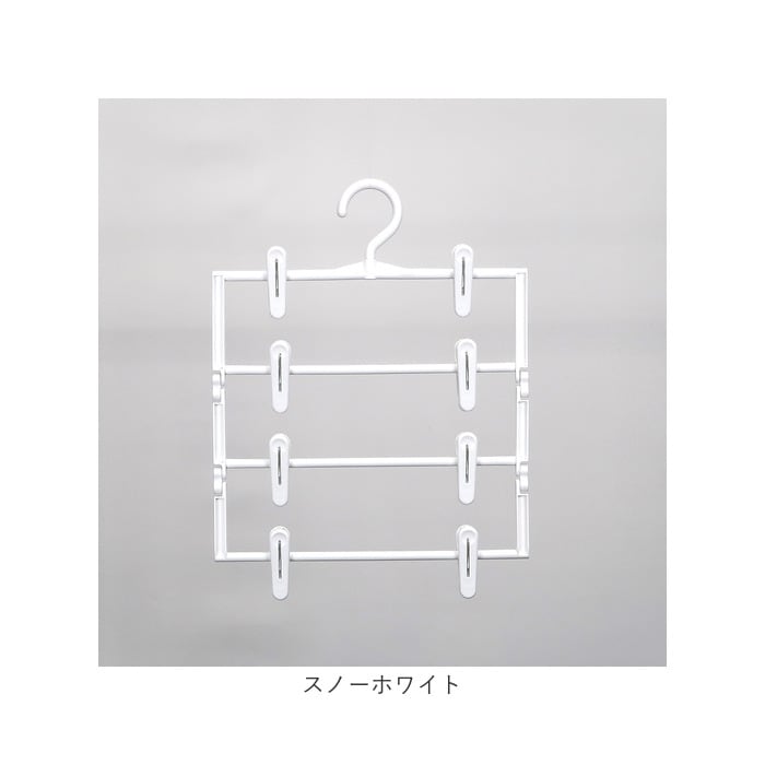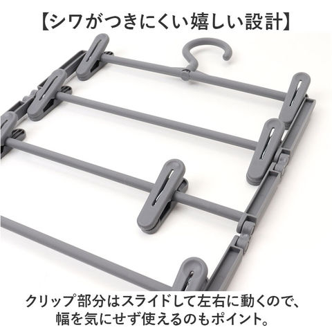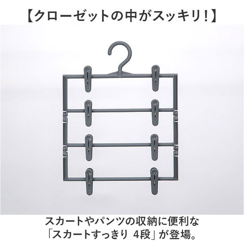 | 商品説明 | 【クローゼットの中がスッキリ!】スカートやパンツの収納に便利な「スカートすっきり 4段」が登場。【4枚まで掛けられる】・1本で4枚まで掛けられるので、余分なスペースをとらずコンパクトに収納可能!【シワがつきにくい嬉しい設計】クリップ部分はスライドして左右に動くので、幅を気にせず使えるのもポイント。【ストレスフリーな使い心地】クリップは軽い力で取り外しでき、しっかりと挟み込むので厚手の衣類にも対応。【いろいろな場所で使える】フックやクリップは回転するので、いろいろな場所で使え、掛け外しもスムーズ。【スカート以外にも】スカートやパンツはもちろん、スカーフ・マフラーなどの小物類にも◎ |