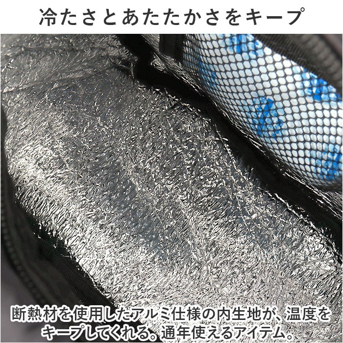 | 素材 | [表生地]ナイロン100% [裏生地]アルミ蒸着フィルム [断熱材]発泡ポリエチレン [ポケット部分・持ち手]ポリエステル100% |