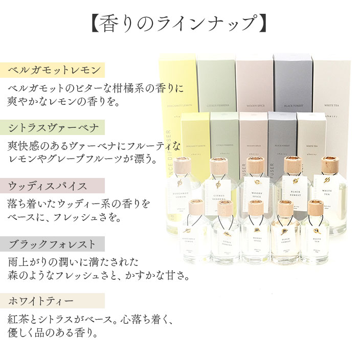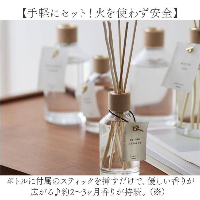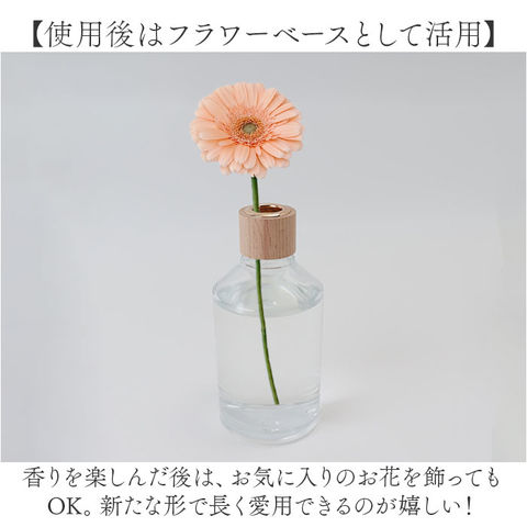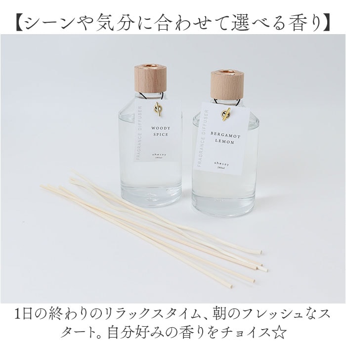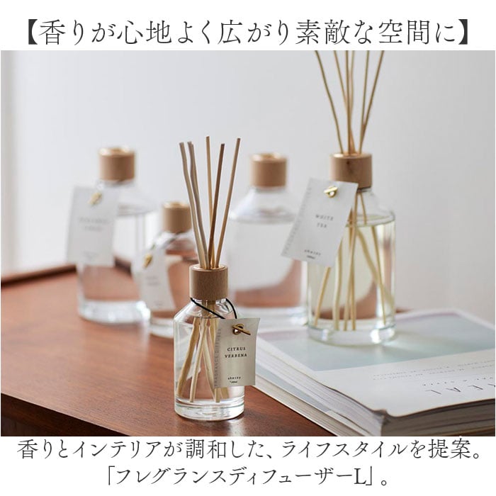 | 商品説明 | 【香りが心地よく広がり素敵な空間に】香りとインテリアが調和した、ライフスタイルを提案。「フレグランスディフューザーL」。【インテリアに溶け込む上品なつくり】ウッドキャップとクリアボトルの、洗練されたデザイン。空間の邪魔をせず、視覚的にも癒しを♪【手軽にセット!火を使わず安全】ボトルに付属のスティックを挿すだけで、優しい香りが広がる♪約2~3ヶ月香りが持続。(※)芳香期間は、使用環境によって異なります。【デザイン性を高める2種スティック】ラタンスティック4本と、ウィロースティック2本が付属。見た目が美しくおしゃれに飾れる!【シーンや気分に合わせて選べる香り】・1日の終わりのリラックスタイム、朝のフレッシュなスタート。自分好みの香りをチョイス☆【使用後はフラワーベースとして活用】香りを楽しんだ後は、お気に入りのお花を飾ってもOK。新たな形で長く愛用できるのが嬉しい!【毎日の生活にお気に入りの香りを】お部屋や玄関先などに香りをプラスすることで、いつもの暮らしがより豊かに。【頑張っている人へのご褒美に】自分用にはもちろん!慌ただしい毎日を送る方へ、香りのギフトを。程よい存在感のLサイズ。【香りのラインナップ】ベルガモットレモン:ベルガモットのビターな柑橘系の香りに爽やかなレモンの香りを。シトラスヴァーベナ:爽快感のあるヴァーベナにフルーティなレモンやグレープフルーツが漂う。ウッディスパイス:落ち着いたウッディー系の香りをベースに、フレッシュさを。ブラックフォレスト:雨上がりの潤いに満たされた森のようなフレッシュさと、かすかな甘さ。ホワイトティー:紅茶とシトラスがベース。心落ち着く、優しく品のある香り。 |