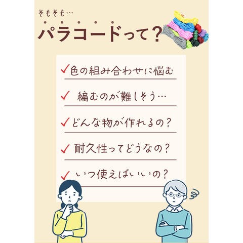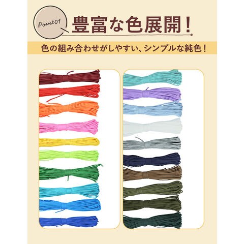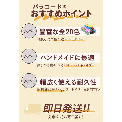 | 商品説明 | 【3点セットでお得!】アウトドアから手芸まで使えるパラコード30mX4mm 1本 純色 3点セット。【柔らかくて編みやすい】しなやかな素材でクセがつきにくく、ハンドメイド作業もスムーズ◎【頼れる長さとボリューム】1本約30m・直径4mmのしっかりとした存在感で、様々な用途に対応!【日常アイテムに変身】スマホストラップから時計ベルトまで、日常使いのアイテムに仕上げられる◎【幅広いシーンで活躍】テントやハンモック設営から洗濯紐・手芸まで、毎日の暮らしに溶け込む万能紐。【ポリ素材の安心仕様】ポリプロピレン&ポリエステル使用で、軽量ながらも頼りがいのある強度〇 |