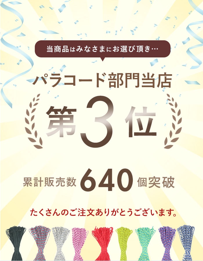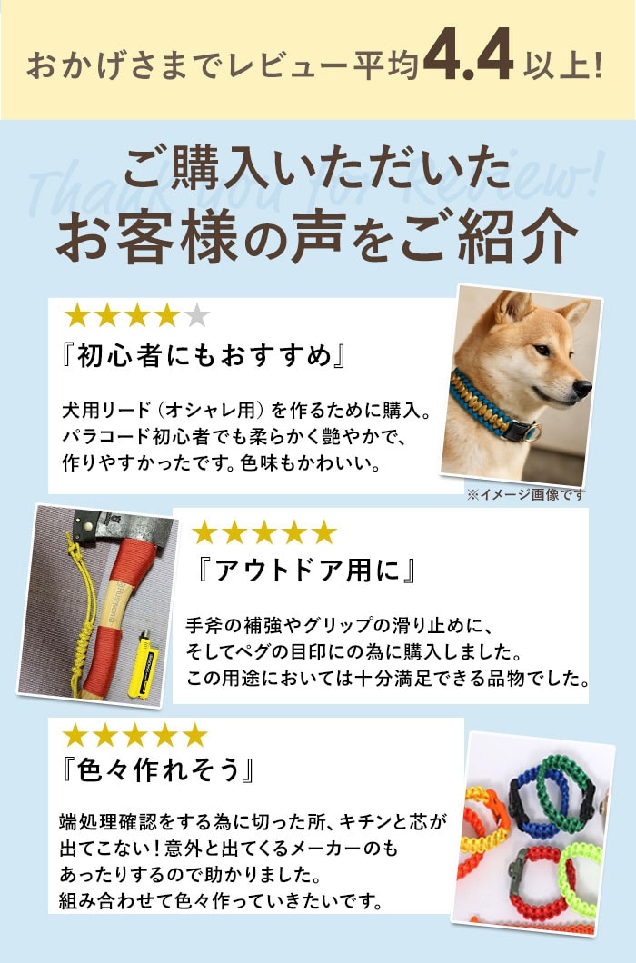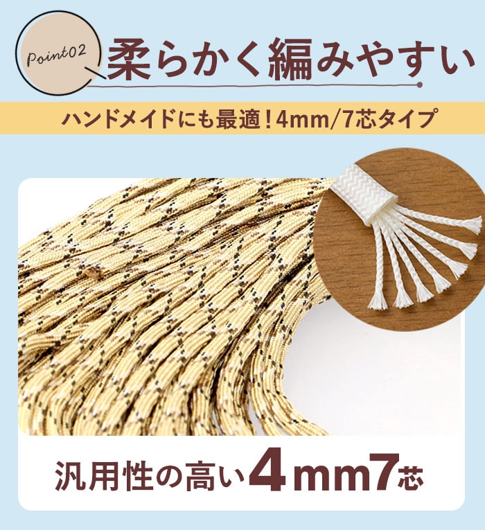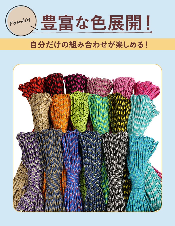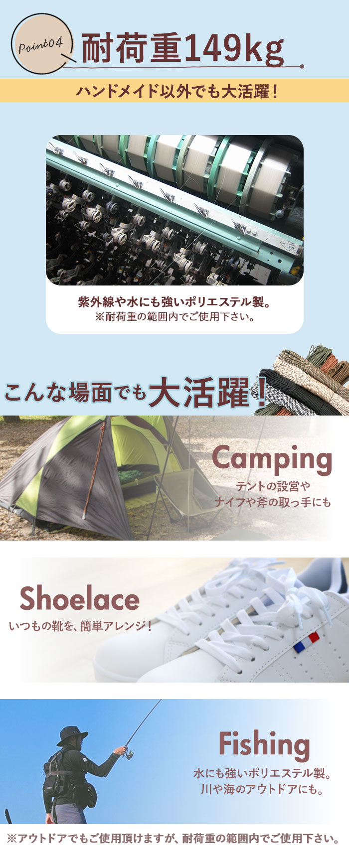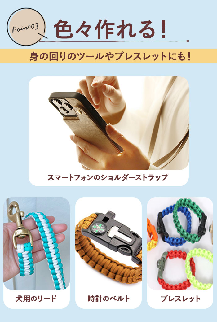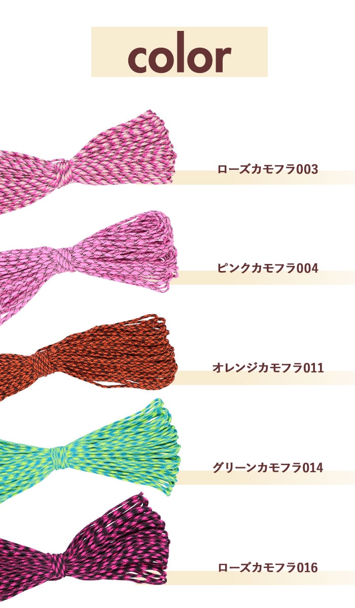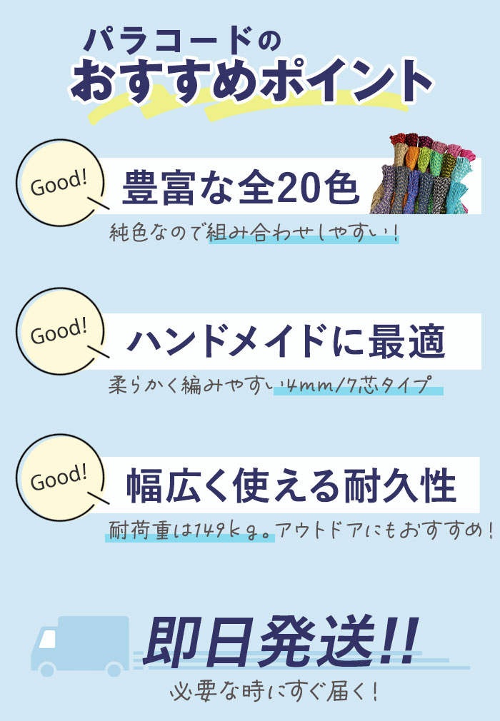 | 商品説明 | ハンドクラフトに最適!柔らかく編みやすいパラコード31m!【ハンドメイド用に★】わんちゃんのリード用や、ブレスレットなどのハンドメイド用に★【ワンカラーで編んでもバイカラーで編んでも】柔らかいので複雑な編み方もラクラク♪鮮やかなネオンカラーから落ち着いたダークカラーまで揃っているから、ワンカラーで編んでもバイカラーで編んでも◎【素敵なハンドメイドライフを】プチプラなので、色んなカラーを揃えて素敵なハンドメイドライフを楽しんで♪※こちらはハンドメイド用の商品となります。キャンプや登山など、アウトドアでのご利用はお控え下さい。 |