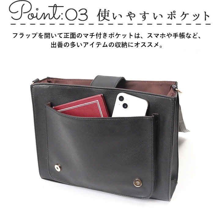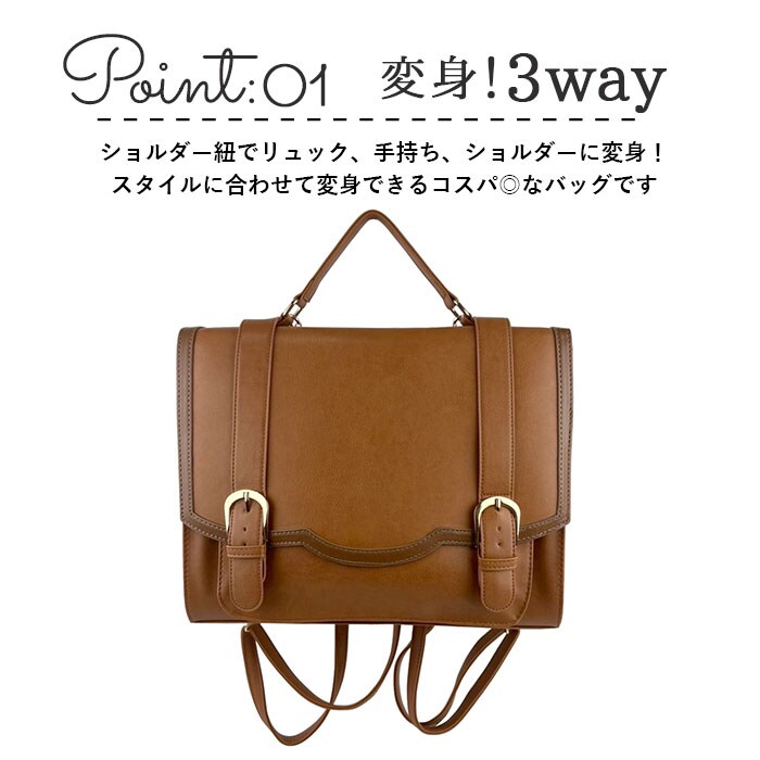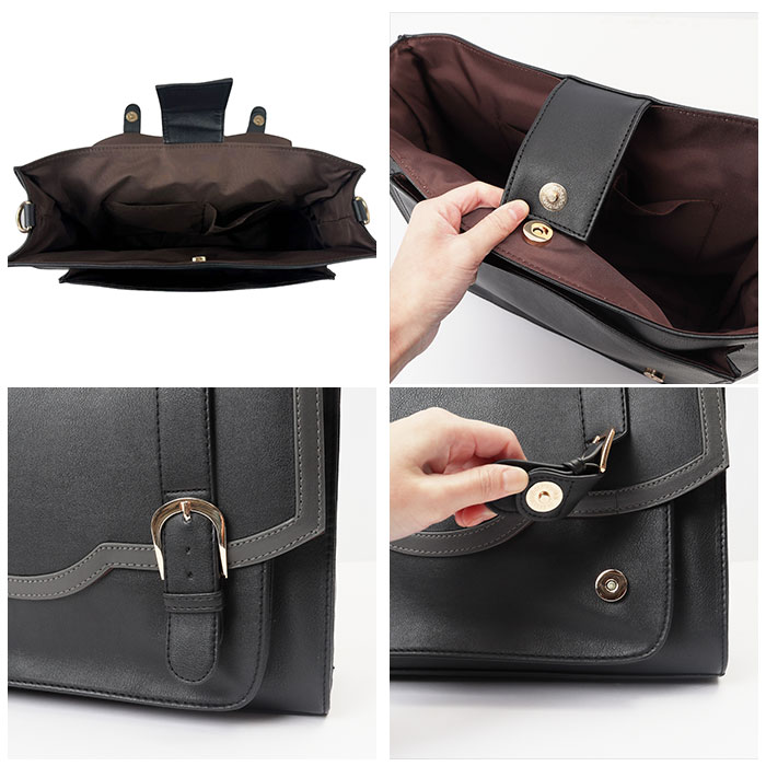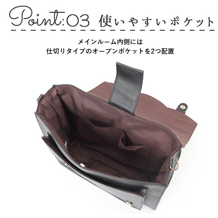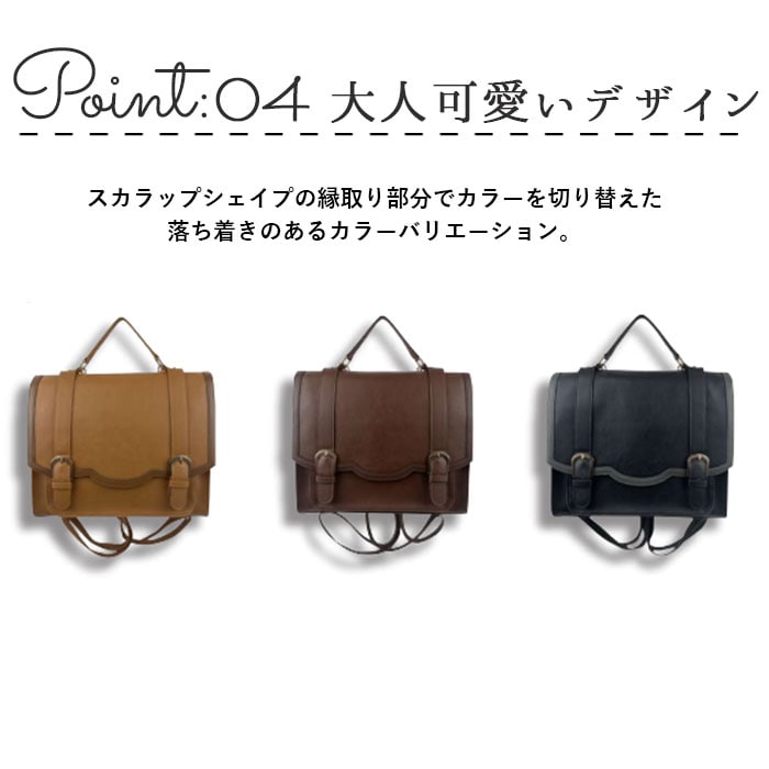 | 商品説明 | シンプルさの中に、大人可愛さがチラリと覗く♪シーンに合わせて持ち方自在「3WAYスカラップサッチェル」が新登場。【印象的なフラップデザイン】・「スカラップ(scallope)」とは、ほたての貝殻のこと。波形の緩やかな曲線がフェミニンな雰囲気を演出する、スカラップシェイプがデザインのワンポイント。【マグネットで簡単オープン】ゴールドのバックル金具が目を惹く前面フラップは、小物の出し入れに手間取らないマグネット開閉タイプ。【小物がスッキリ仕分けポケット】メインルーム内側には、仕切りタイプのオープンポケットを2つ配置。開口部にもマグネットフラップが付いて、小物が飛び出しにくい安心仕様。【通学やタウンユースにぴったり】メインルームはビジネス書類やテキストがゆったり収まるA4対応サイズ。500mlペットボトルも立てたまま収納でき、通学用やタウンユースに大活躍。【小物にクイックアクセス】フラップを開いて正面のマチ付きポケットは、スマホや手帳など、出番の多いアイテムの収納にオススメ。【スタイリング自在の3WAY】ハンドルを持って「手提げスタイル」、取り外し可能なストラップで「リュック」と「ショルダーバッグ」スタイルに合わせて使い分けでのできる3WAY仕様。【センスが際立つバイカラー】スカラップシェイプの縁取り部分でカラーを切り替えた、落ち着きのあるカラーバリエーション。さりげなく肩に掛けるだけで、誰でも素敵な大人女子に。【ポケット仕様】[メインルーム内側]オープンポケット×2[前面]オープンポケット×1 |