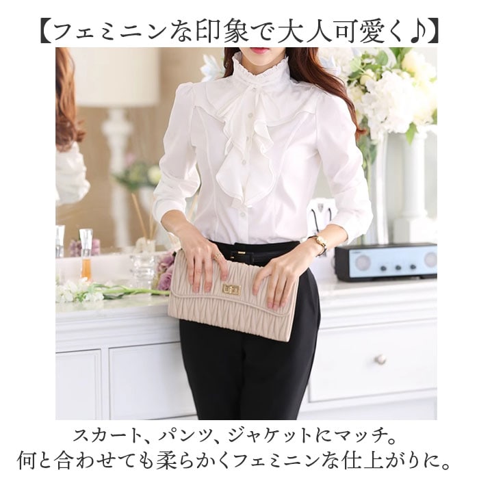 | 商品説明 | 【パッと華やぐフリルがポイント♪】お出かけもオフィスもフォーマルもOK!「長袖ブラウス」が登場。【フリル×ラメラインで華やかに】ボリューミーなフリルと、ボタンのラメラインでお顔周りをパッと明るく演出してくれる。【フェミニンな印象で大人可愛く♪】スカート、パンツ、ジャケットにマッチ。何と合わせても柔らかくフェミニンな仕上がりに。【ロングシーズン使える長袖タイプ】薄手の長袖なので、季節の変わり目~羽織と合わせて冬にも大活躍!【いろんなシーンで着られる1枚】お仕事、お出かけ、パーティーなどのフォーマルもお任せ。1枚は欲しい大人のブラウス。 |