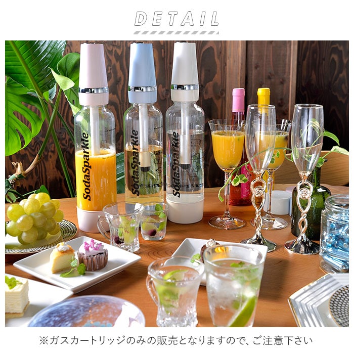 | 注意点 | 製品に添付の説明書をよくお読みになり正しくお使いください。1回のチャージに1本のみ使用してください。ガスカートリッジはガスを出し切るまで取り外さないでください。乳幼児の手の届かないところで使用、保管してください。ガスカートリッジは未使用で破棄しないでください。使用後は空(穴が空いている)であることを確認の上、お住まいの自治体などで定められた方法にしたがって処分してください。(材質:スチール)ソーダスパークル専用。指定外の機器に使用すると、破損・ケガの原因になります。使用・保管は火気の近く、直射日光を避け40度以下でおこなってください。強制高圧ガスを使用しています。破損・ケガの原因になります。落下・転倒など強い衝撃を与えないでください。破損・ケガの原因になります。キズ・変形・サビのあるカートリッジは使わないでください。破損・ケガの原因になります。カメラやモニターの性質により、画像と実物の色の違いがある場合がございますのでご理解願います。 |