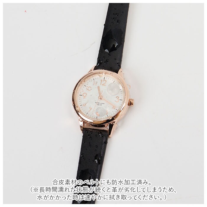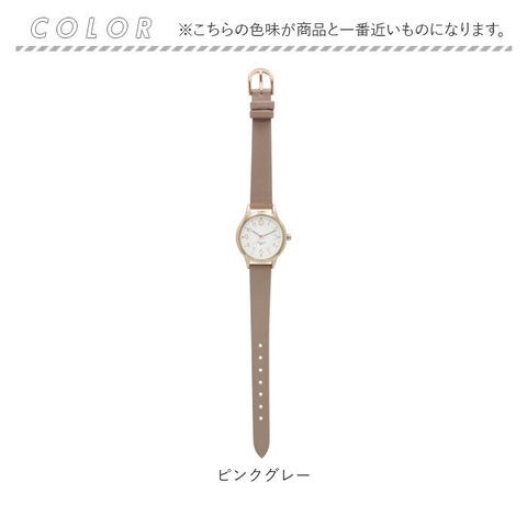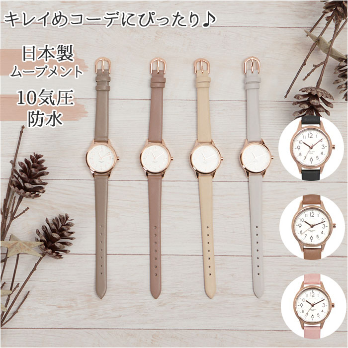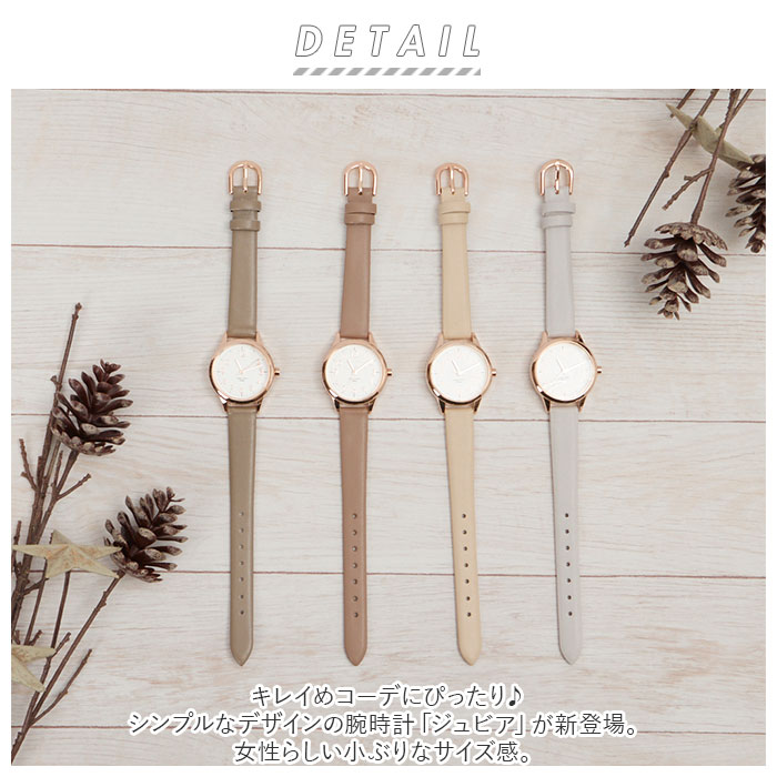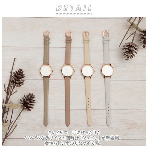 | 商品説明 | キレイめコーデにぴったり♪シンプルなデザインの腕時計「ジュビア」が新登場。女性らしい小ぶりなサイズ感。金具や文字盤、文字盤ケースにピンクゴールドカラーを取り入れ、上品な印象を演出♪うれしい10気圧防水(日常強化防水)仕様。洗顔や水仕事、雨で少し水がかかる程度なら大丈夫♪(※海やプール、温泉での使用は避けてください。)合皮素材のベルトにも防水加工済み。(※長時間濡れた状態が続くと革が劣化してしまうため、水がかかった時は速やかに拭き取ってください。)ベルトの長さは7段階にサイズ調節可能。日本製のムーブメントを使用。落ち着きのあるカラーバリエーション。ビジネスシーンにもおすすめ。 |