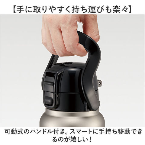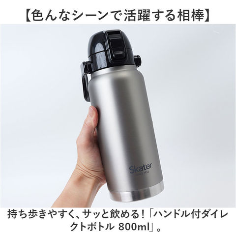 商品説明【色んなシーンで活躍する相棒】持ち歩きやすく、サッと飲める!「ハンドル付ダイレクトボトル 800ml」。【保冷機能付で美味しい温度をキープ】本体内側と外側が真空断熱された、ステンレス2重構造タイプ。冷たさが長持ち◎【片手で簡単ワンプッシュオープン】キャップ部分は、片手でワンプッシュ。屋外などでも使いやすい、直飲みタイプ。【キャップに安全ロック機能を搭載】プッシュボタンの上部を指でスライドするだけの、安全ロック機能付き。誤作動をガード。【飲みやすいキャップロック設計】キャップは後ろに倒した位置で固定。飲む時に戻らず、鼻に当たる心配も不要。【ゴクゴク水分補給できる形状】斜め形状の飲み口。口当たりも滑らかで、ダイレクトに飲みやすいのがポイント。【たっぷり入る大容量ボトル】容量は800ml!レジャーやスポーツシーンなどのお供にもぴったり。【外出前のドリンク準備がスムーズ】本体はドリンクを注ぎやすい広口設計で、大きめの氷もすっぽり。お手入れもしやすい◎【手に取りやすく持ち運びも楽々】可動式のハンドル付き。スマートに手持ち移動できるのが嬉しい!【スタイリッシュなデザイン】年代や性別問わず使いやすい、シンプルな仕上がり。プレゼントにもおすすめ。