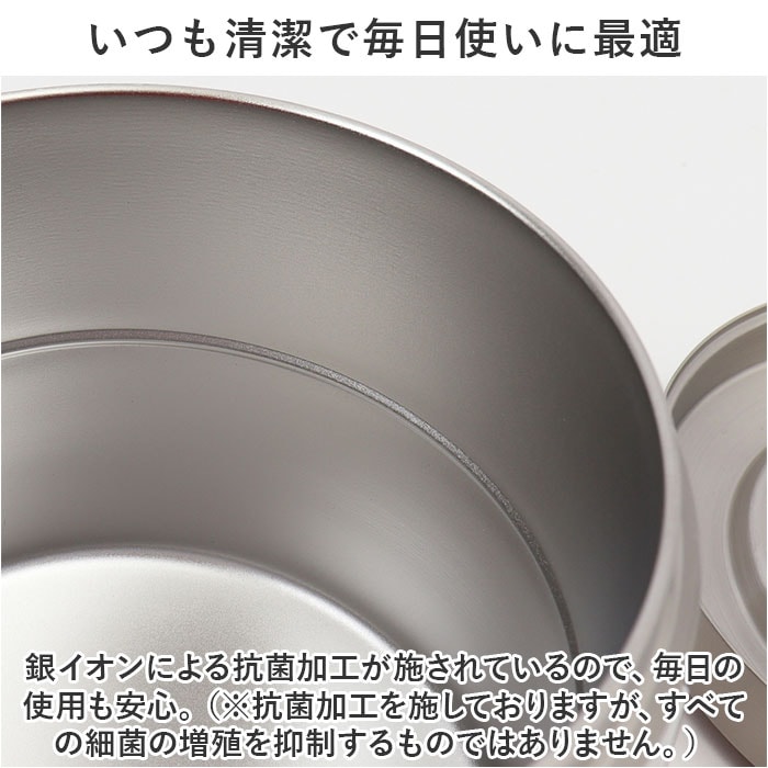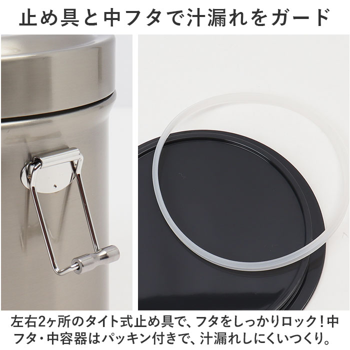 | 素材 | [本体・フタ]ステンレス(アクリル樹脂塗装) [中容器・中フタ]ポリプロピレン [パッキン]シリコーンゴム [底板]熱可塑性エラストマー [止具]ステンレス |