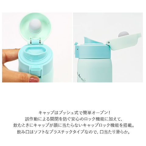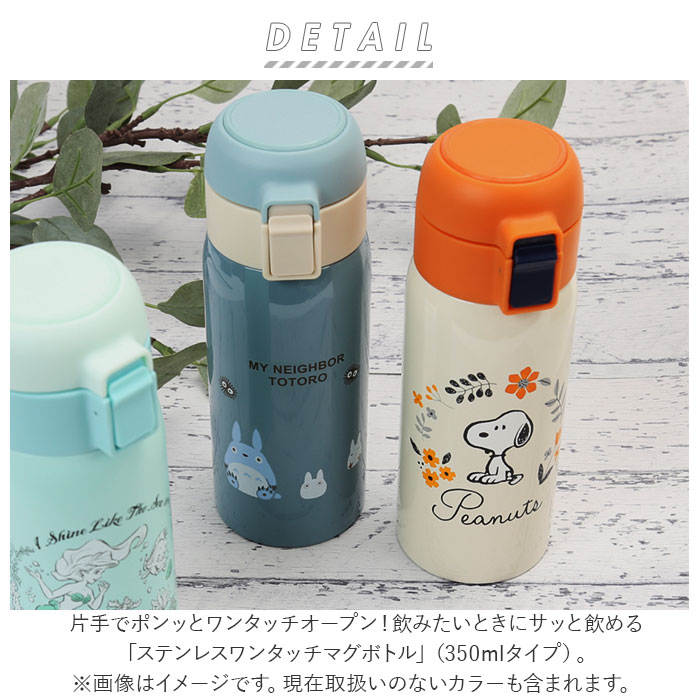 | 商品説明 | 片手でポンッとワンタッチオープン!飲みたいときにサッと飲める「ステンレスワンタッチマグボトル」(350mlタイプ)。温かいお茶も冷たいドリンクも、飲み頃温度を保って美味しく楽しめるステンレス真空二重構造採用。キャップはプッシュ式で簡単オープン!誤作動による開閉を防ぐ安心のロック機能に加えて、飲むときにキャップが顔に当たらないキャップロック機能を搭載。飲み口はソフトなプラスチックタイプなので、口当たり滑らか。いつでもどこでもこまめに水分補給♪ボトル開口部が広口になったワイド設計で、飲み物に氷が入れやすく、毎朝のドリンクの準備がより手軽に。飲み口パッキンとフタパッキンは、簡単につけ外しができて、お手入れ楽ちん。水切りカゴで迷子にならず、見つけやすいカラーパッキン仕様。通勤・通学用のカバンにちょこんと入れて持ち運びに便利な、容量350mlタイプ。学生さんにはもちろん、オフィスで働くOLさんにも人気のキャラクターが勢ぞろい!お気に入りをチョイスしてね♪ |