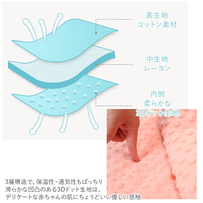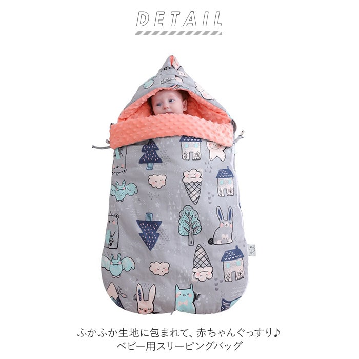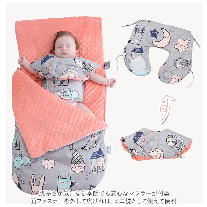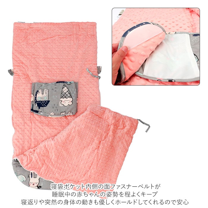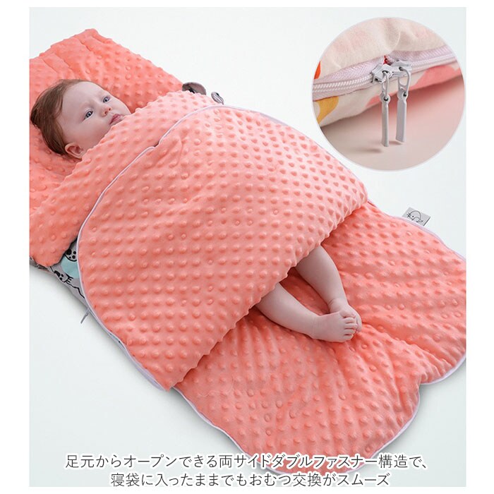 | 商品説明 | ふかふか生地に包まれて、赤ちゃんぐっすり♪ベビー用スリーピングバッグ。ユニークな寝袋スタイルのポケットにすっぽりと入ったら、すやすや快適なスリーピングタイム。表生地にコットン素材、中生地にレーヨン、内側に柔らかな3Dドット生地を組み合わせた3層構造で、保温性・通気性もばっちり。滑らかな凹凸のある3Dドット生地は、デリケートな赤ちゃんの肌にちょうどいい優しい感触。寝袋ポケット内側の面ファスナーベルトが睡眠中の赤ちゃんの姿勢を程よくキープ。活発な赤ちゃんの寝返りやモロー反射のような突然の身体の動きも優しくホールドしてくれるので安心。足元からオープンできる両サイドダブルファスナー構造で、寝袋に入ったままでもおむつ交換がスムーズに。(※ファスナー両端には挟み込み防止カバー付き)肌寒さが気になる季節でも安心なマフラーが付属。面ファスナーを外して広げれば、ミニ枕として使えて便利。開口部のフラップ両端を面ファスナーで貼り合わせればフード状になるので、頭もあったか快適。忙しいママさんに嬉しい、洗濯機での丸洗いOK!いつでも清潔に使えてお手入れも楽ちん。お昼寝用のお布団としてはもちろん、抱っこ用のおくるみとしても使える。 |