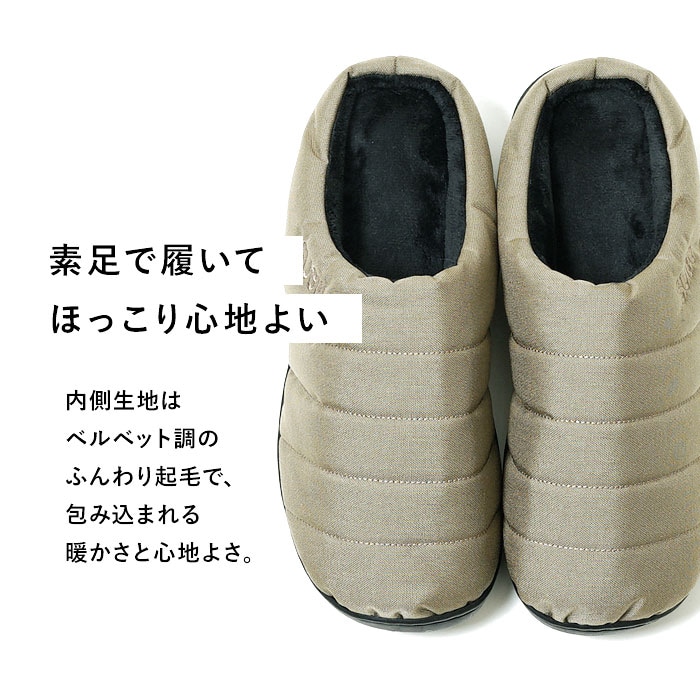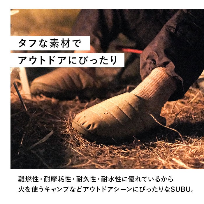 | 商品説明 | 【“SUBU”・・誰も知らない冬のサンダル】寒い時期、ふと出掛ける時に素足で履ける、今までにない秋冬サンダル「SUBU NANNEN -ナンネン-」【ダウンのような暖かさで足元包む】ダウンジャケットのようなキルティング素材で足元をふんわり包み、冷え込む朝も暖かな履き心地。【素足のままでも至福の心地よさ】内側の生地をベルベット調の滑らかな起毛素材で仕上げ、素足が包み込まれるような心地よさ。【足裏に優しい4層構造ソール】4層構造のフッドベッドが着地時の衝撃をふわっと吸収。抜群のフィット感と優しい履き心地が魅力。【スリッパみたいにサッと履ける】大きく開いた履き口と踵部分が低めになったフラット形状で、つま先がスルッと入り着脱スムーズ。【焚き火を囲むキャンプシーンに】・「SUBU -NANNEN-」は難燃性に優れたCORDURA 305Dを生地に使用し、火を使うキャンプに最適。テントの出入り時の脱ぎ履きも手間取らない!※CORDURA(R)FABRICとは、摩耗、耐久性、耐水性に優れた繊維であり、ミリタリーやワークウェアにも使用されるファブリックブランドです【滑りにくいアウトソール】合成ゴム製のアウトソールにはしっかりと厚みを持たせ、地面からの冷えを感じにくいつくり。底面の滑り止めの凹凸には、SUBUのロゴをさりげなく刻印。【ちょっとそこまでのお出掛けに】ご近所へのお買い物やワンちゃんのお散歩に気軽に履ける!寒い季節でも素足のままで足元快適。【ルームシューズとしても大活躍】クッション性のあるインソールはリラックスして過ごすおうち時間にも最適。オフィスサンダルにも◎【大切な人とリンクコーデも自在】カップルやファミリーでコーディネートできる22cm~29.5cmまでの全4サイズ展開。【アウトドアに身軽に持ち運び】開口部を止水ファスナーで仕上げたCORDURA生地の収納袋は、肩掛けしやすいショルダーベルト付。ほのかに浮かびあがるロゴデザイン入りで、ギフトにも最適。 |