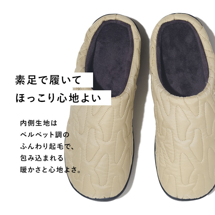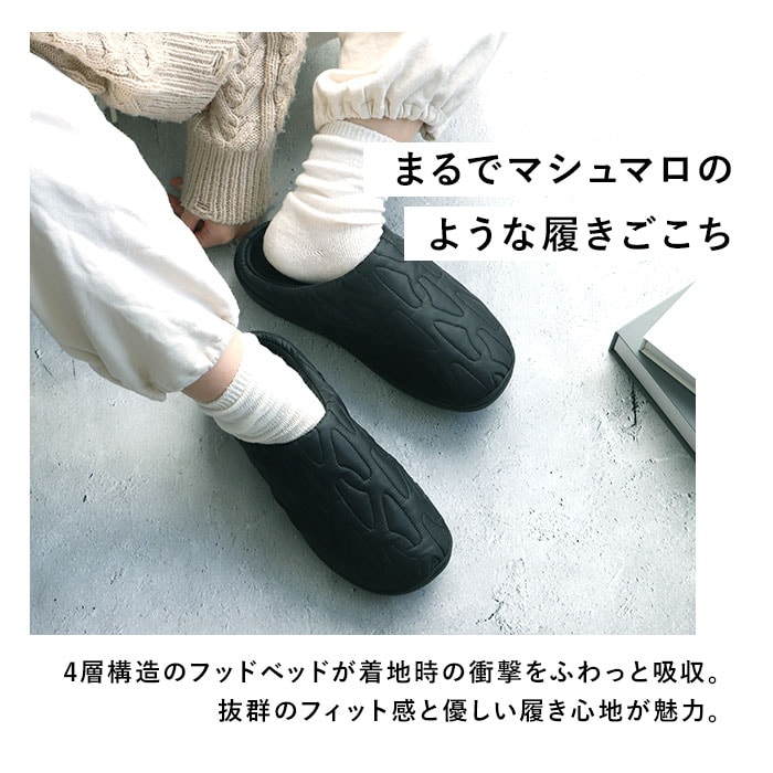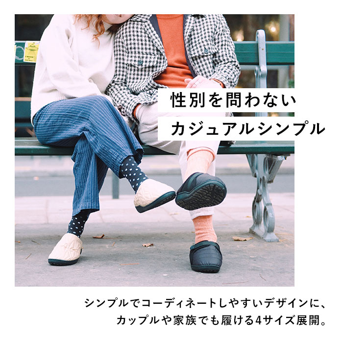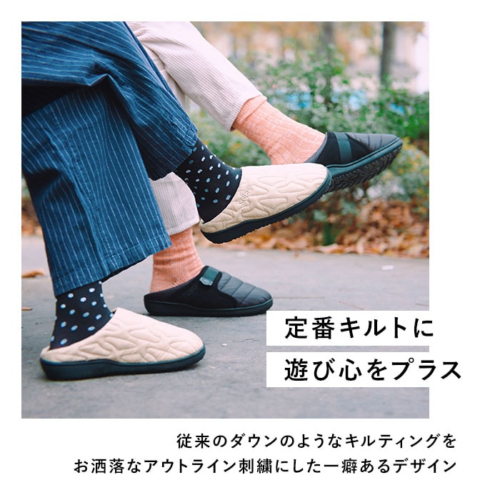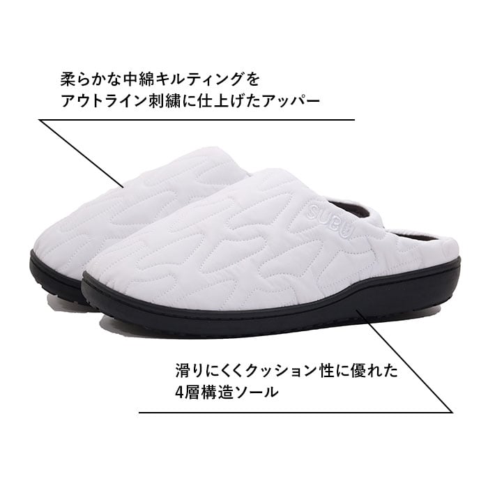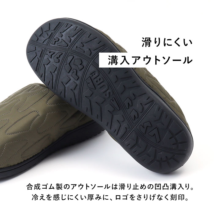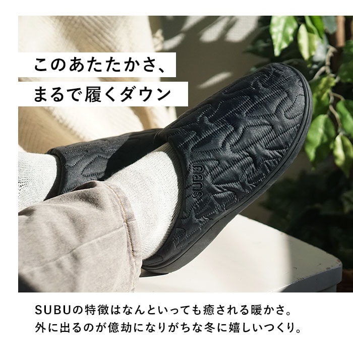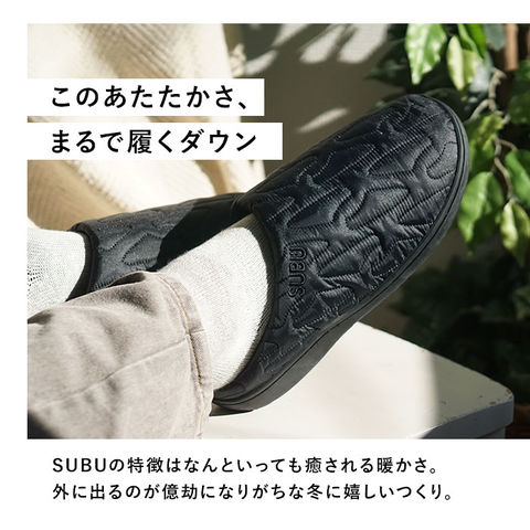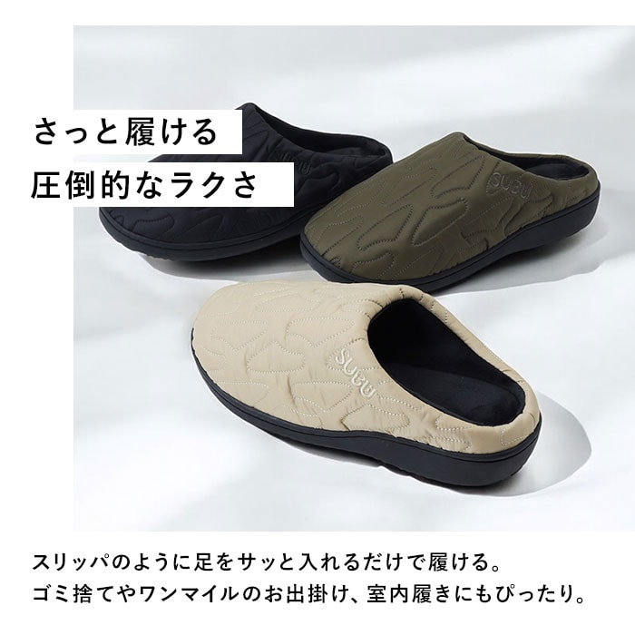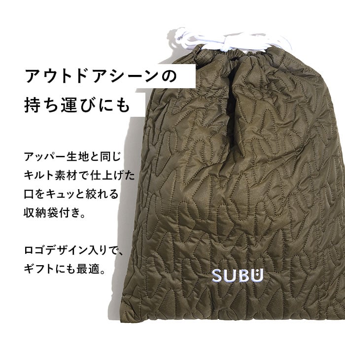 | 商品説明 | 【“SUBU”・・誰も知らない冬のサンダル】寒い時期、ふと出掛ける時に素足で履ける今までにない秋冬サンダル「SUBU OUTLINE -アウトライン-」【ダウンのような暖かさで足元包む】ダウンジャケットのようなキルティング素材で足元をふんわり包み、冷え込む朝も暖かな履き心地。【定番キルト生地に遊び心をプラス】シンプルな4本線刺繍の定番キルティングデザインに、お洒落なアウトライン刺繍タイプが仲間入り♪【素足のままでも至福の心地よさ】内側の生地をベルベット調の滑らかな起毛素材で仕上げ、素足が包み込まれるような心地よさ。【足裏に優しい4層構造ソール】4層構造のフッドベッドが着地時の衝撃をふわっと吸収。抜群のフィット感と優しい履き心地が魅力。【スリッパみたいにサッと履ける】大きく開いた履き口と踵部分が低めになったフラット形状で、つま先がスルッと入り着脱スムーズ。【水滴や汚れに強いテフロン加工】アッパー生地は、はっ水性・防汚性に優れたテフロン加工を施し、突然の雨やアウトドアでも安心。【滑りにくいアウトソール】合成ゴム製のアウトソールにはしっかりと厚みを持たせ、地面からの冷えを感じにくいつくり。底面の滑り止めの凹凸には、SUBUのロゴをさりげなく刻印。【ちょっとそこまでのお出掛けに】ご近所へのお買い物やワンちゃんのお散歩に気軽に履ける!寒い季節でも素足のままで足元快適。【ルームシューズとしても大活躍】クッション性のあるインソールはリラックスして過ごすおうち時間にも最適。オフィスサンダルにも◎【大切な人とリンクコーデも自在】カップルやファミリーでコーディネートできる22cm~29.5cmまでの全4サイズ展開。【巾着タイプの収納袋が付属】アッパー生地と同じキルト素材で仕上げた、口をキュッと絞れる収納袋付きで、持ち運びに便利!【飾らないシンプルコーデにフィット】普段のコーデやアウトドアスタイルに合わせやすい、すっきりアースカラー&モノトーンのラインナップ。履き口の「SUBU」のロゴ刺繍が控えめなワンポイント。 |