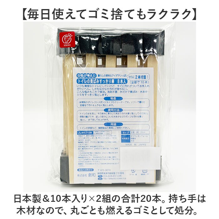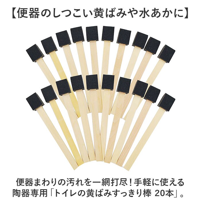 | 商品説明 | 【便器のしつこい黄ばみや水あかに】便器まわりの汚れを一網打尽!手軽に使える陶器専用「トイレの黄ばみすっきり棒 20本」。【面倒なトイレ掃除の心強い味方】清潔に保ちたいけれど、お手入れが大変…。水だけで落ちるすっきり棒で、悩みを解決☆【便利なダイレクトスポンジタイプ】研磨材とスポンジが一体化!ソフトで密着性に優れ、諦めかけていた汚れをムラなく落とす◎【フチ裏などの黄ばみにもアプローチ】スポンジはクッション性があり、汚れ面や隙間にフィットするポリウレタンフォーム。【研磨剤で汚れをしっかりかき落とす】スポンジにはきめ細やかな研磨剤も入っており、ガンコな汚れも洗剤不要で落とせる仕様。【衛生面も安心の使い捨てアイテム】汚れたトイレブラシを置いておく必要もなし!力を入れやすいコンパクト形状で、便器ピカピカ。【毎日使えてゴミ捨てもラクラク】日本製&10本入り×2組の合計20本。持ち手は木材なので、丸ごとも燃えるゴミとして処分。 |