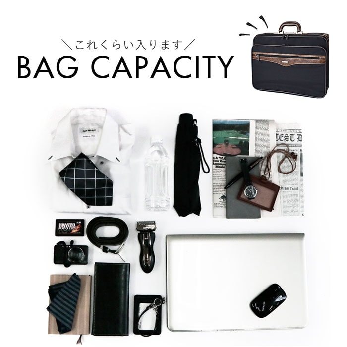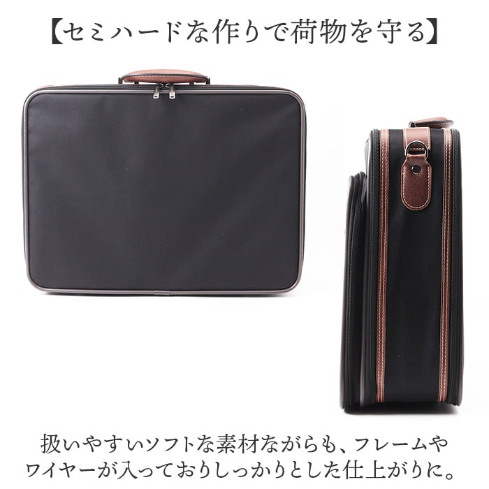 商品説明【日帰りの出張や小旅行に】ビジネスにも旅行にも使える♪アタッシュケースが発売。【セミハードな作りで荷物を守る】扱いやすいソフトな素材ながらも、フレームやワイヤーが入っておりしっかりとした仕上がりに。【日帰りや1泊程度の旅行に】前面の収納ルームはタオルや着替えなど1泊程度の荷物の収納が可能。【よれにくいクロスバンド付き】シャツなど移動中よれにくい、クロスバンドを底面に配置。【仕分けて収納できる2ルーム】仕分けに便利な2ルーム仕様。着替えや書類など種類で分けて収納可能。【ジャバラで書類整理】背面の収納ルームは3層の蛇腹構造で、用途ごとに入れられるのもポイント。B4サイズもOK!【2WAY仕様】手持ちはもちろん、付属のショルダーベルトを取り付ければ斜め掛けや肩掛けにも対応。【カジュアルすぎずビジネスに】本革のようなムラとシボ感がある合皮をポイントに使用。ラフすぎずビジネスに使えるアイテム【細々とした小物も整頓】複数のポケットを設け、細々とした小物をすっきり収納可能。【自立するので置き場所迷わず】底鋲付き&しっかりとした作りで自立するので、置きたいときにサッと置ける。【嬉しい撥水加工】ちょっとした雨や汚れを弾く撥水加工済み。お手入れも拭き取るだけで楽ちん♪※【ポケット仕様】メインルーム(前)・・・オープンポケット×1、クロスバンド×1メインルーム(後)・・・ジャバラポケット×3フロントポケット内・・・オープンポケット×3、メッシュポケット×2、ペン挿し×3最前面・・・ファスナーポケット×1【注意点】※完全防水ではございません
