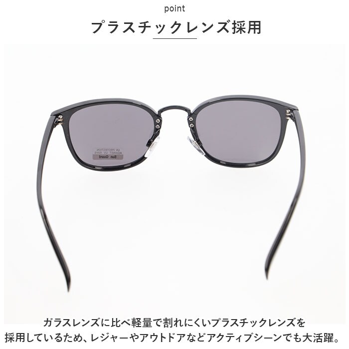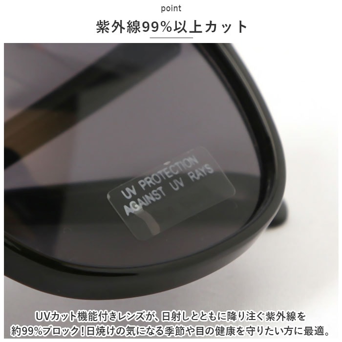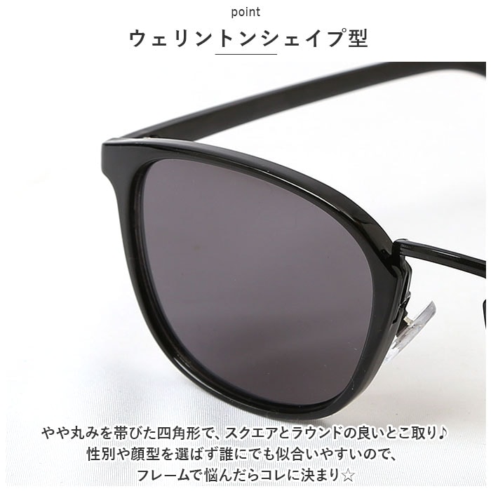 | 商品説明 | 迷ったらウェリントン!何にでも合わせやすいユニセックスのサングラス。【ウェリントンシェイプ型】やや丸みを帯びた四角形で、スクエアとラウンドの良いとこ取り♪性別や顔型を選ばず誰にでも似合いやすいので、フレームで悩んだらコレに決まり☆【お洒落なだけじゃない♪】フレームは軽量のプラスティック素材を採用。メタル素材のブリッジが、品よくまとまったデザインに仕上げ、トレンドを掴みつつどんなシーンにも馴染みやすい。クリングスノーズパットで自分の顔にしっかりフィット。ノーズ部分の微調整も可能。【紫外線99%以上カット】UVカット機能付きレンズが、日射しとともに降り注ぐ紫外線を約99%ブロック!日焼けの気になる季節や目の健康を守りたい方に最適。【選べるレンズカラー】シックなブラックからクリアタイプまで、バラエティに富んだカラーのレンズが日射しの眩しさを低減し、良好な視界を確保。(※可視光線透過率は、95%~15%まで、カラーにより異なります。)【プラスチックレンズ採用】ガラスレンズに比べ軽量で割れにくいプラスチックレンズを採用しているため、レジャーやアウトドアなどアクティブシーンでも大活躍。【ユニセックスモデル】普段使いのメガネのようにファッションに取り入れやすいシンプルなデザインで、男性でもさりげなく着用できるユニセックスモデル。フレーム両サイドのメタルパーツが印象的なワンポイント。 |