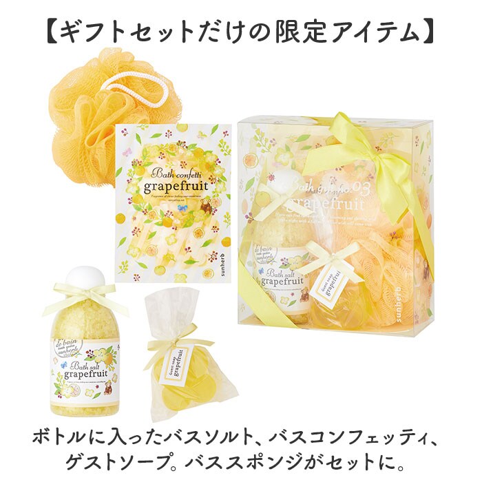 | 容量 | [バスソルトボトル]275g [バスコンフェッティバッグ]15g [ゲストソープ]42g |