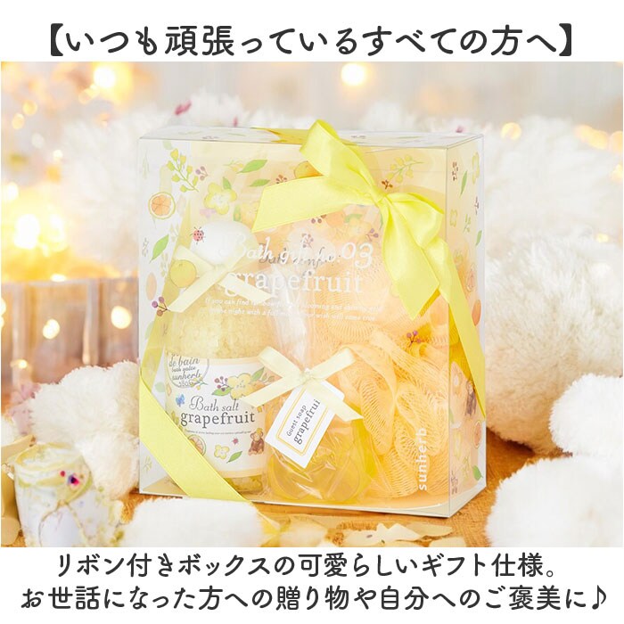 | 商品説明 | 【癒やしのバスタイムでリラックス】お花やハーブの香りで、心も体も満たされる♪「sunherb バスギフト」。【心地よい香りで暮らしを楽しく彩る】空想の島”サンハーブ島”で、犬のスノーとゆかいな仲間たちが創り出す物語が背景◎【ギフトセットだけの限定アイテム】ボトルに入ったバスソルト、バスコンフェッティ、ゲストソープ。バススポンジがセットに。【浴槽に入れて、優雅な気分に】温浴効果を上げるバスソルトに、可愛く浮かぶバスコンフェッティ。ゆったり湯船に浸かる日に。【たっぷりの泡で優しく洗い上げる】お湯を含ませたスポンジで、ソープを泡立て☆ふんわり泡で体を洗える、心地よい使用感が魅力。【気分で使い分けたいラインナップ】ふわっと爽やかラベンダー。うっとり幸せピュアローズ。シャキっとまぶしいグレープフルーツ。【いつも頑張っているすべての方へ】リボン付きボックスの可愛らしいギフト仕様。お世話になった方への贈り物や自分へのご褒美に♪ |