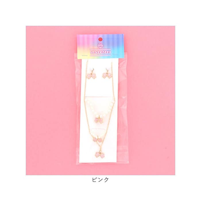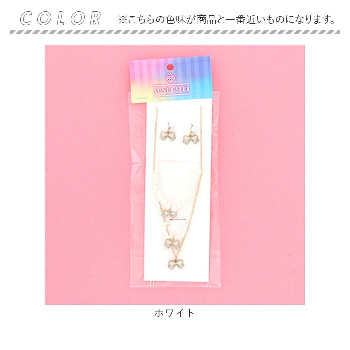| サイズ | ピアス1ペア:リボン約1.5cm/ネックレス1点:全長約37cm(+5cm) ブレスレット1点:ゴムタイプ、内径約4.5cm/リング1点:ゴムタイプ、内径約1.5cm/ |