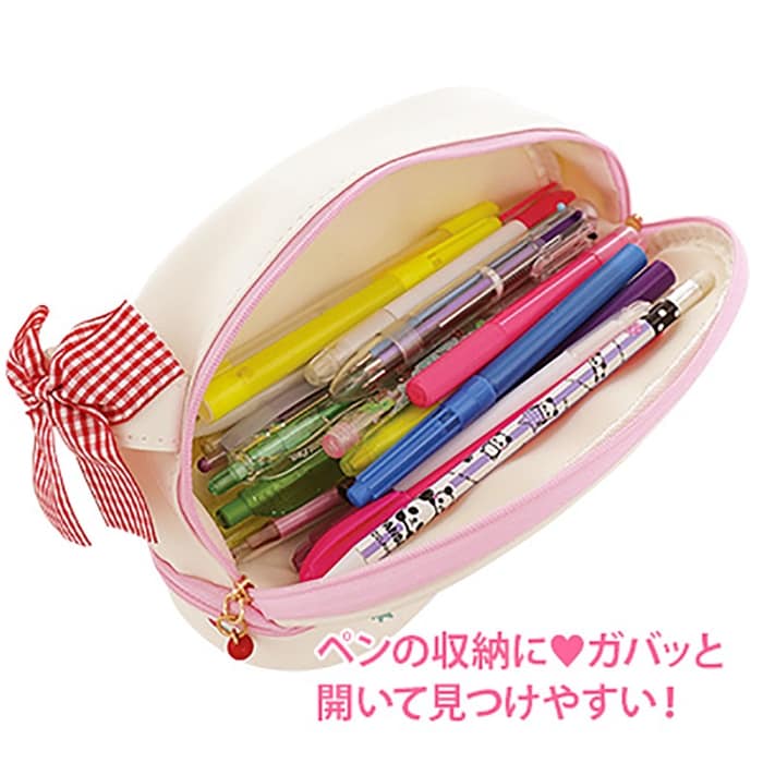 白色 チェックリボン付きいちご柄大容量ペンポーチ【ホワイト】