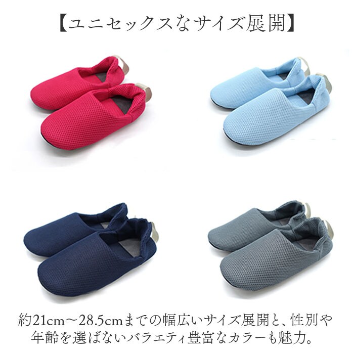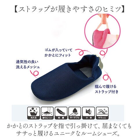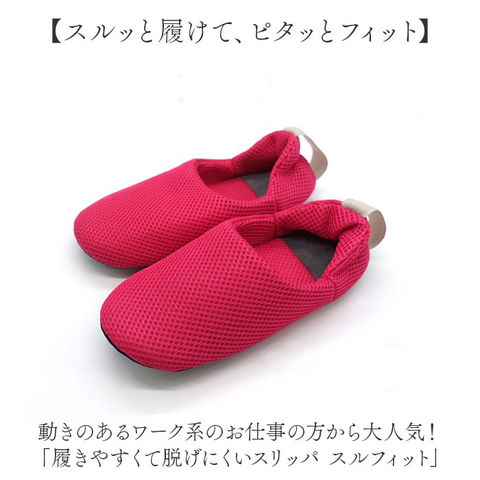 | 商品説明 | 【スルッと履けて、ピタッとフィット】動きのあるワーク系のお仕事の方から大人気!「履きやすくて脱げにくいスリッパ スルフィット」【ストラップが履きやすさのヒミツ】かかとのストラップを指で引っ掛けて、屈まなくてもササっと履けるユニークなルームシューズ。【かかとにフィットして脱げにくい】コロンと丸みのある形と、かかと部分に内蔵した伸縮ゴムが足をすっぽり包みこんで脱げにくい♪【サラッと快適・立体メッシュ生地】アッパー生地表面やインソールは、ふわっと柔らかくサラっと通気性のよい立体メッシュ仕上げ。【簡単ウォッシャブル仕様】汚れが気になったら、ザブザブ丸洗いが可能。こまめに洗っていつも清潔、気持ちの良い履き心地。※優しく手洗いでお手入れするか、洗濯機をご使用の場合は、洗濯ネットに入れてお洗濯してください。【パタパタ音がしにくい底面加工】スリッパ底面はフローリングの上でも滑りにくく、静音効果のあるPVCスエード調レザーを採用。【ふわっと軽くて持ち運びに便利】立体メッシュ生地の軽い仕上がりなので、カバンの片隅にちょこんとしまって持ち運びも楽ちん。【ユニセックスなサイズ展開】約21cm~28.5cmまでの幅広いサイズ展開と、性別や年齢を選ばないバラエティ豊富なカラーも魅力。※カラーにより、サイズ展開が異なります。ピンク・ブルーはS・M・Lの3サイズ、ネイビーはS・M・L・LLサイズの4サイズ、グレーはL・LLサイズの2サイズをご用意しております。【さまざまな職業の方から絶大な支持】病院や介護施設、履物の脱ぎ履きが多い訪問サービスなど、動きを伴うお仕事の現場で大活躍!【アクティブママさんにもオススメ】授業参観や入学式などの学校行事、お料理教室やお稽古ごとなどアクティブに動くシーンにお勧め。 |