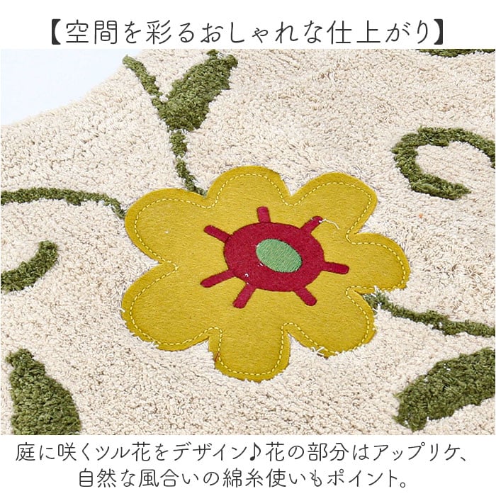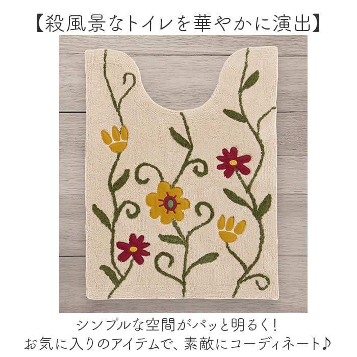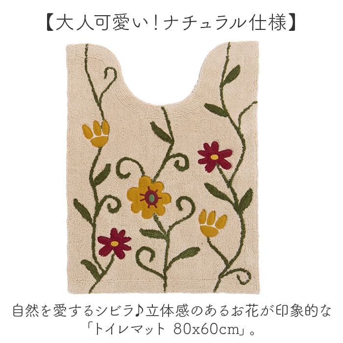 | 商品説明 | 【大人可愛い!ナチュラル仕様】自然を愛するシビラ♪立体感のあるお花が印象的な「トイレマット 80x60cm」。【空間を彩るおしゃれな仕上がり】庭に咲くツル花をデザイン♪花の部分はアップリケ、自然な風合いの綿糸使いもポイント。【ふんわり心地よい、柔らかな生地感】程よい厚みの綿100%素材を使用。踏み心地もバツグン。【滑りにくく安心の裏面特殊加工】裏面に特殊コーティング加工を施し、滑りをガード。安全面にも配慮したつくり。【丸洗いできてお手入れラクラク】汚れが気になったら、ネットに入れて洗濯機洗いOK。いつも清潔をキープ。(※)洗濯機の弱モードor手洗いモードで単独洗いしてください。一部のドラム式洗濯機では、洗濯や脱水ができない場合がございます。【殺風景なトイレを華やかに演出】シンプルな空間がパッと明るく!お気に入りのアイテムで、素敵にコーディネート♪ |