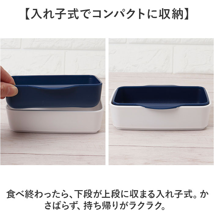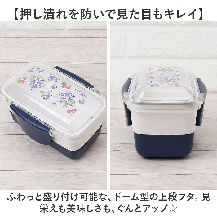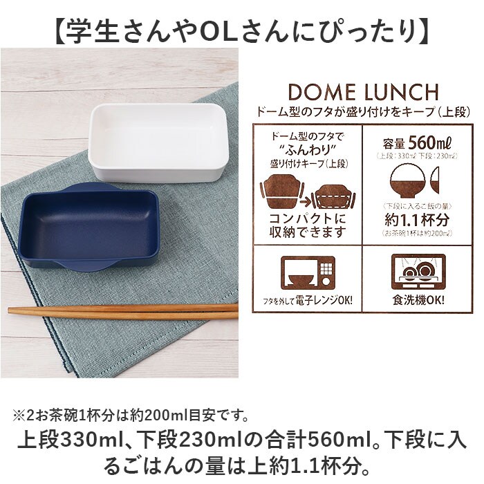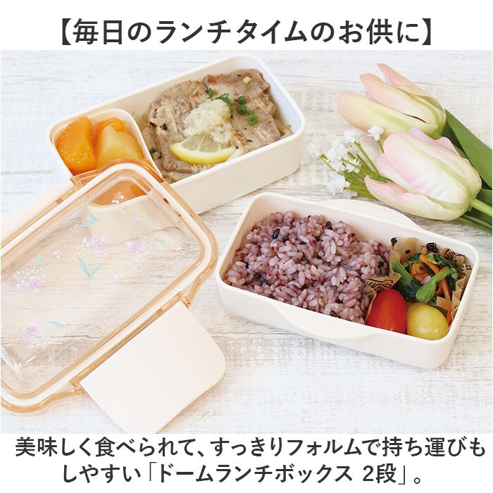 | 商品説明 | 【毎日のランチタイムのお供に】美味しく食べられて、すっきりフォルムで持ち運びもしやすい「ドームランチボックス 2段」。【2点ロックで汁漏れの心配を軽減】両サイドのロック&フタ裏にはパッキン付き。汁漏れしにくく持ち運び時も安心。(※1)密閉仕様ではありません。【押し潰れを防いで見た目もキレイ】ふわっと盛り付け可能な、ドーム型の上段フタ。見栄えも美味しさも、ぐんとアップ☆【学生さんやOLさんにぴったり】上段330ml、下段230mlの合計560ml。下段に入るごはんの量は上約1.1杯分。(※2)お茶碗1杯分は約200ml目安です。【ごはんがくっつきにくい加工】下段内側にエンボス加工(特殊樹脂加工)をプラス。ご飯粒を残すことなくキレイに完食◎【入れ子式でコンパクトに収納】食べ終わったら、下段が上段に収まる入れ子式。かさばらず、持ち帰りがラクラク。【レンジ対応!熱々ごはんが復活】フタを外して電子レンジでの温めが可能。オフィスでも温かいランチを楽しめる!【食洗機OK!洗い物の手間を軽減】パーツが少なく、パッキンは取り外せて衛生的◎すべて食洗機対応で、忙しい毎日の味方☆【清潔キープできてデイリーに活躍】本体に抗菌加工を施し、抗菌効果で菌が99%減少。安心の日本製品。(※)全ての細菌の増殖を抑制するものではありません。カラーにより、抗菌加工の有無が異なります。【自分用にもギフトにもおすすめ】ランチタイムが楽しみになる、ナチュラル可愛いデザイン。贈り物にもぴったりな日本製。 |